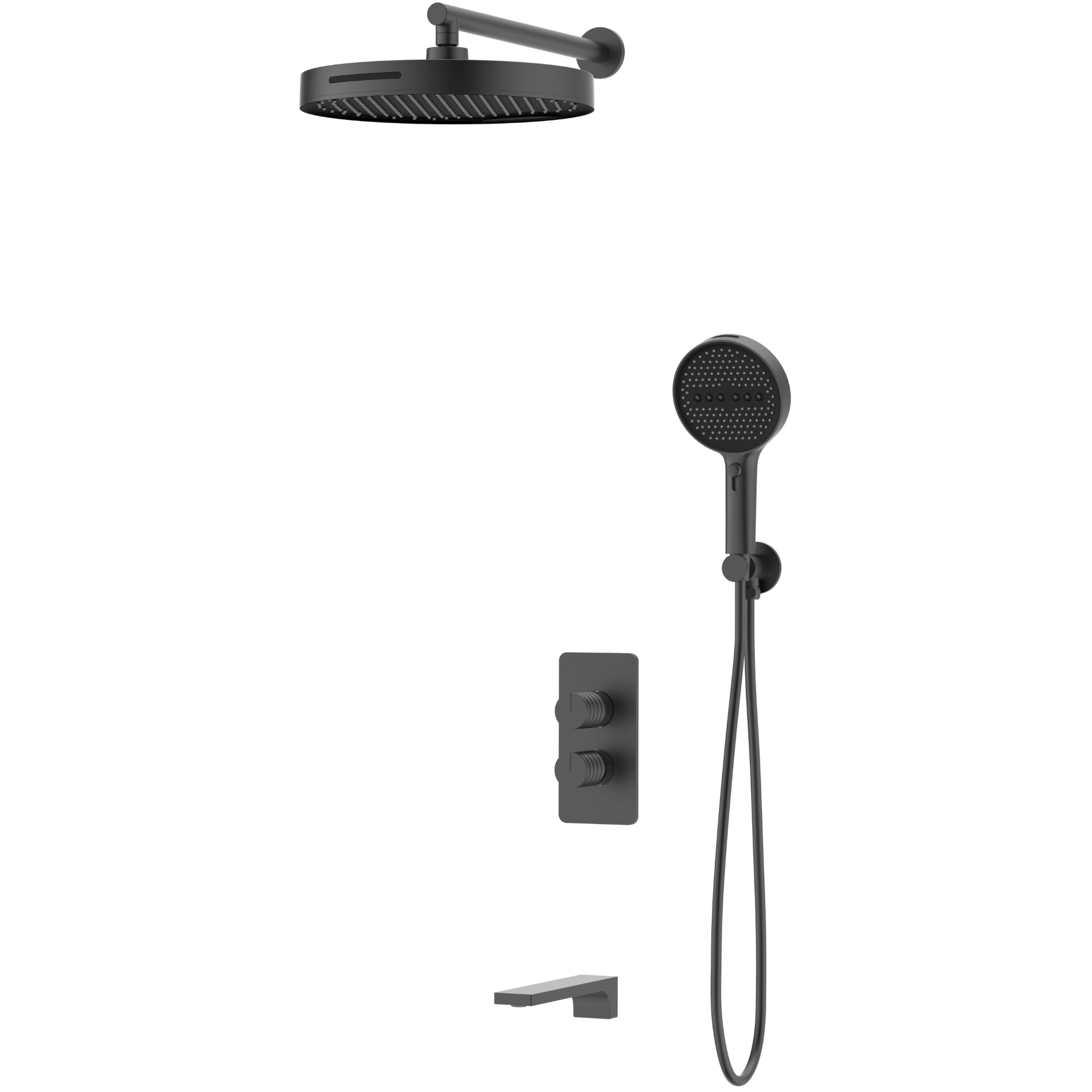 Душевая система встраиваемого монтажа. Материал: латунь. Керамический картридж. Круглый верхний душ 300 мм. Ручной душ 2 функции. Стационарный излив.