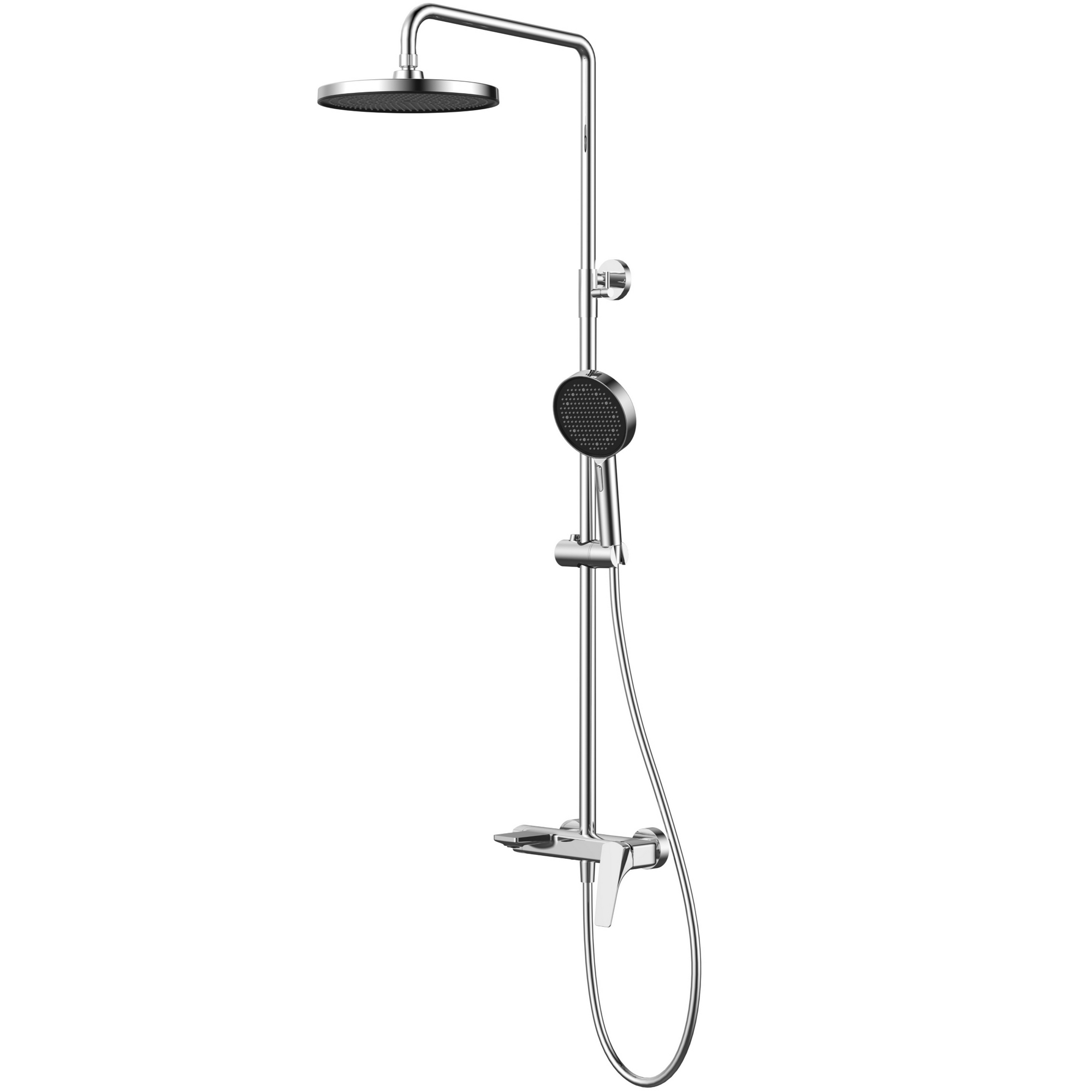 Душевая система настенного монтажа с однорычажным смесителем. Ширина 504 мм. Высота 947-1480 мм. Материал: латунь, нержавеющая сталь. Керамический картридж. Круглый верхний душ 250 мм. Ручной душ 2 функции. Стационарный излив.