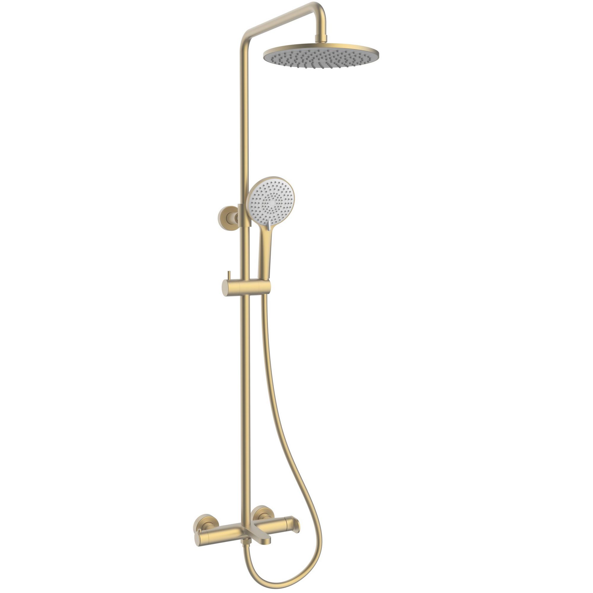 Душевая система настенного монтажа с однорычажным смесителем. Ширина 239 мм. Высота 855-1405 мм. Материал: латунь, нержавеющая сталь. Керамический картридж. Круглый верхний душ 250 мм. Стационарный излив.