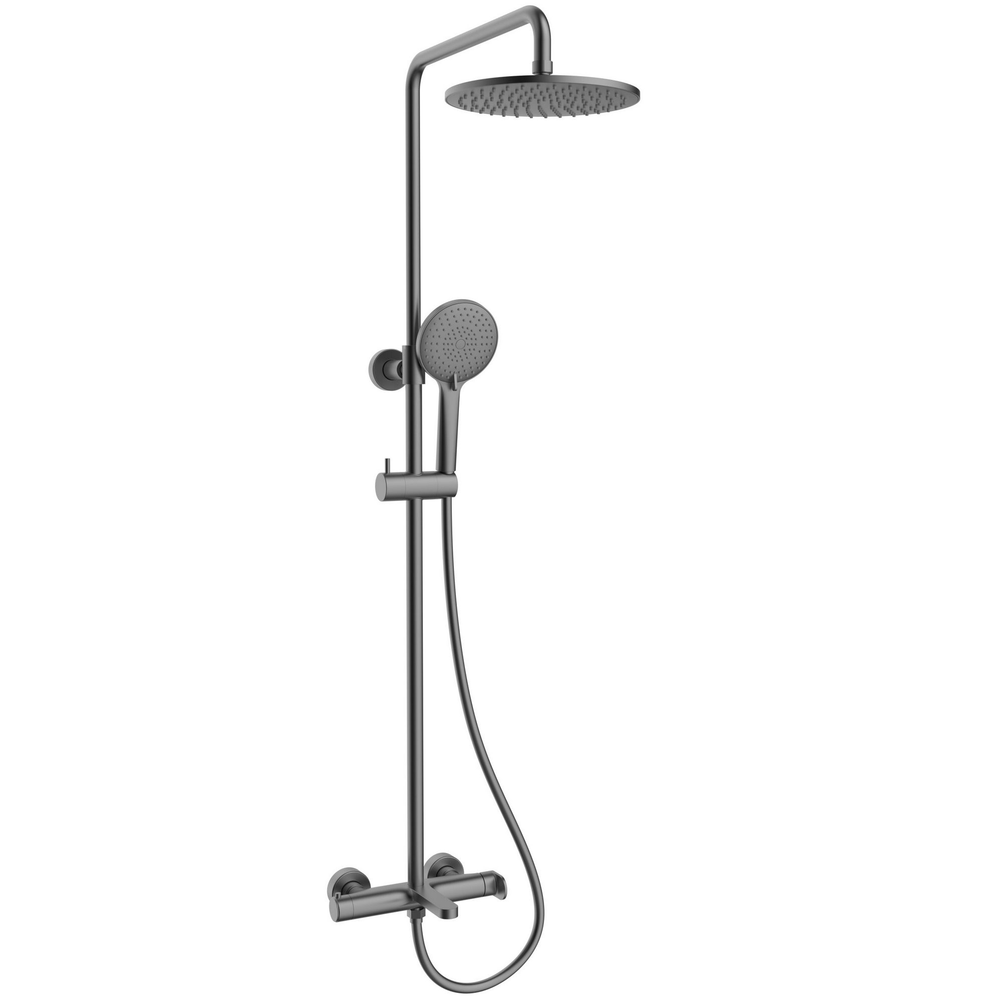 Душевая система настенного монтажа с однорычажным смесителем. Ширина 239 мм. Высота 855-1405 мм. Материал: латунь, нержавеющая сталь. Керамический картридж. Круглый верхний душ 250 мм. Стационарный излив.