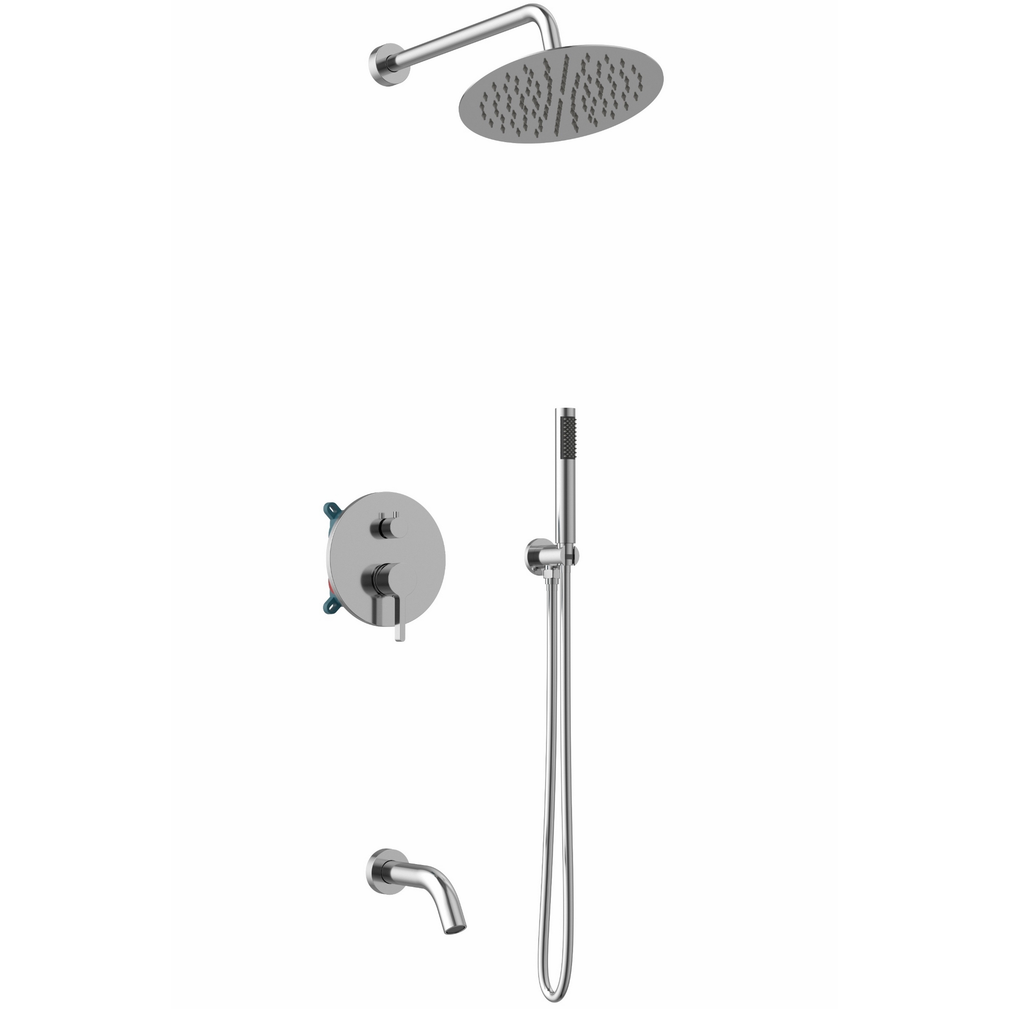 Душевая система встраиваемого монтажа. Материал: латунь, нержавеющая сталь. Керамический картридж. Круглый верхний душ 250 мм. Комплектация: верхний душ, держатель ручного душа, ручной душ, встраиваемый смеситель, стационарный излив.