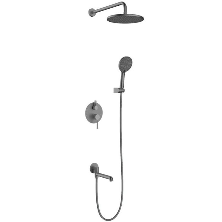 Материал – латунь. Керамический картридж 35 мм. Переключатель с керамическими пластинами (угол поворота – 90°). Поворотный излив с функцией переключения. Аэратор. Душевой шланг 150 см. Душевая лейка 3 режима. Верхний душ Ø250 мм. Держатель лейки.