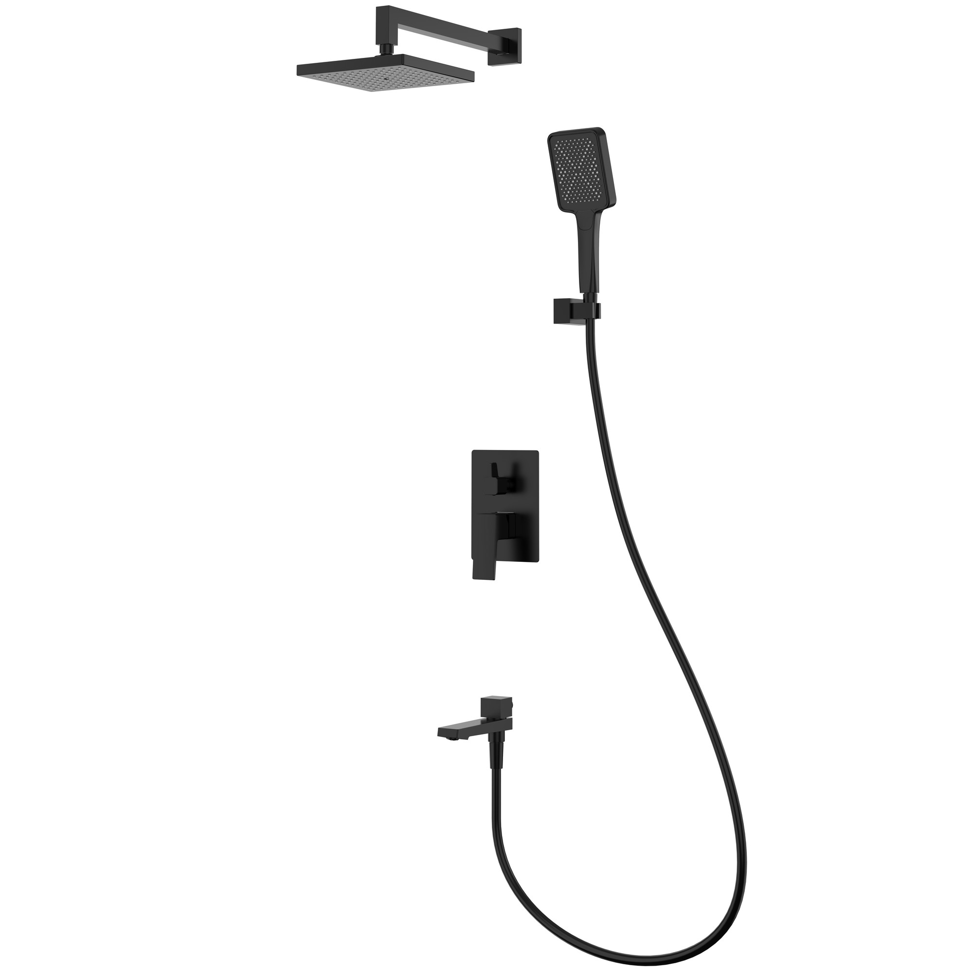 Материал – латунь. Цвет – черный матовый. Керамический картридж 35 мм. Переключатель с керамическими пластинами. Переключатель в изливе. Излив – функция переключения. Душевой шланг 1.8 м. Душевая лейка – 3 режима. Верхний душ – 320x210 мм. Держатель лейки.