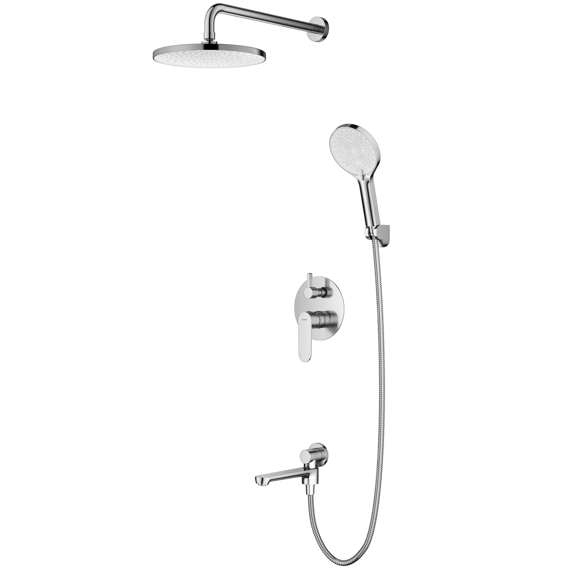 Материал – нержавеющая сталь SUS304. Цвет – сатин. Керамический картридж 35 мм. Переключатель с керамическими пластинами. Переключатель в изливе. Излив – функция переключения. Душевой шланг 1.5 м. Душевая лейка – 3 режима. Верхний душ – ∅250 мм. Держатель лейки.