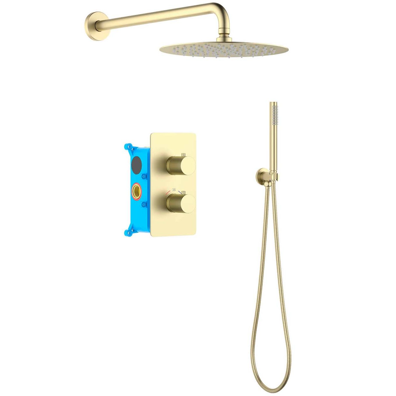 Смеситель термостатический из латуни на 2 потребителя (внешняя и скрытая часть). Душевой гарнитур: лейка, шланг, шланговое подсоединение с держателем. Верхний душ. Декоративные накладки на стену из нержавеющей стали 3 мм.