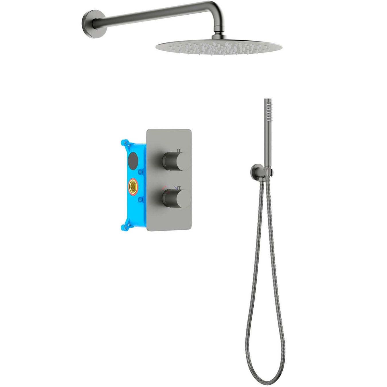 Смеситель термостатический из латуни на 2 потребителя (внешняя и скрытая часть). Душевой гарнитур: лейка, шланг, шланговое подсоединение с держателем. Верхний душ. Декоративные накладки на стену из нержавеющей стали 3 мм.