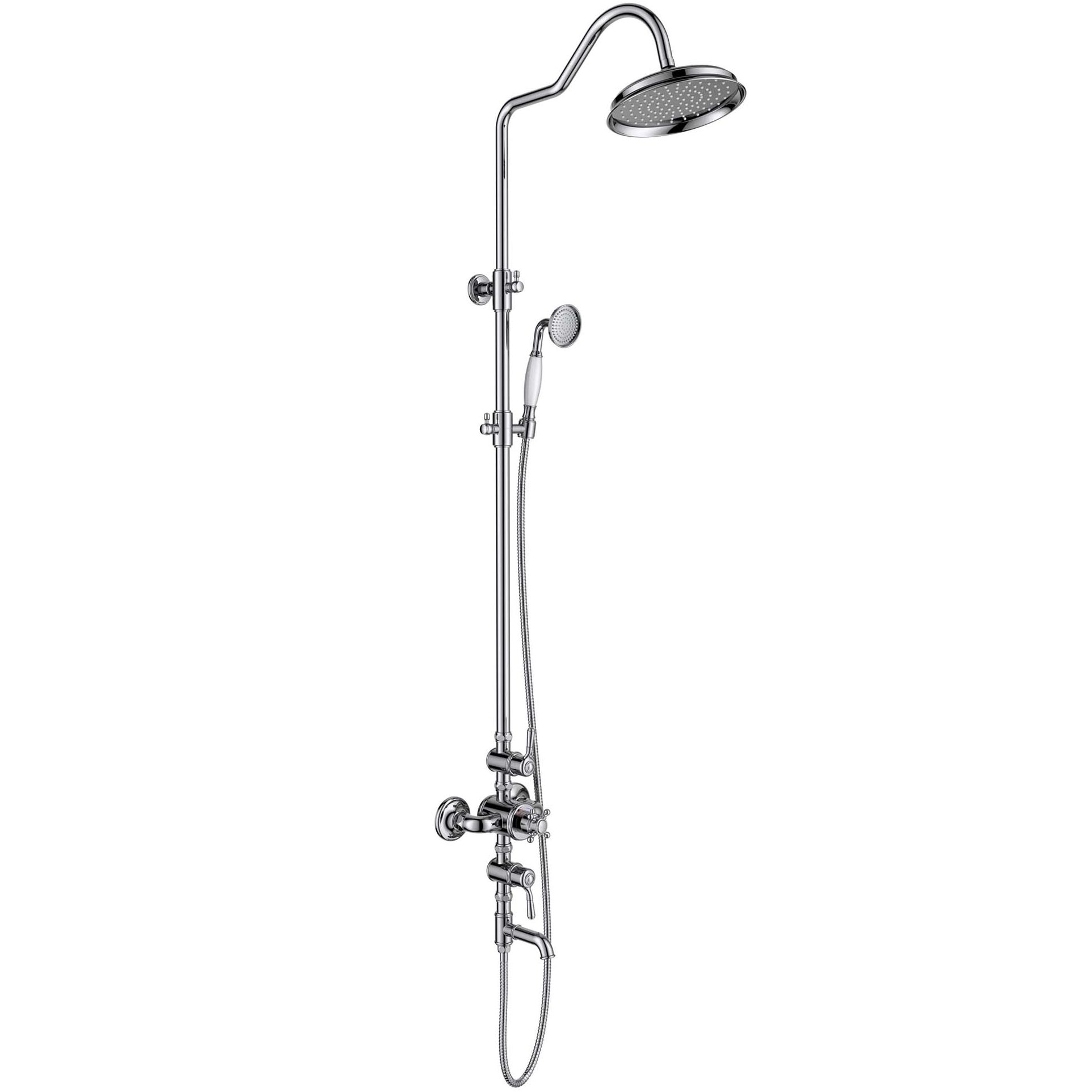 Продуманная функциональность системы. Двухрычажная система регулировки силы струи и температуры воды. Обеспечивает комфортную подачу воды заданной температуры и защиту от ожогов при перепадах давления в водопроводной системе. Корпус с защитой от ожогов. Клапан обратного тока воды. Регулируемая душевая штанга из нержавеющей стали, выдвигающаяся до 1529 мм в высоту. Увеличенный диаметр тропического душа. Верхний душ с изменяемым углом. Легкая очистка силиконовых форсунок тропического душа от известкового налета. Высокопрочные материалы. Лаконичный дизайн. Постоянная температура воды и защита от ожогов. Комплект поставки: тропический душ, душевая лейка, рейлинг, душевой шланг из нержавеющей стали, смеситель, излив, S-образные эксцентрики, декоративные отражатели, монтажный комплект.
