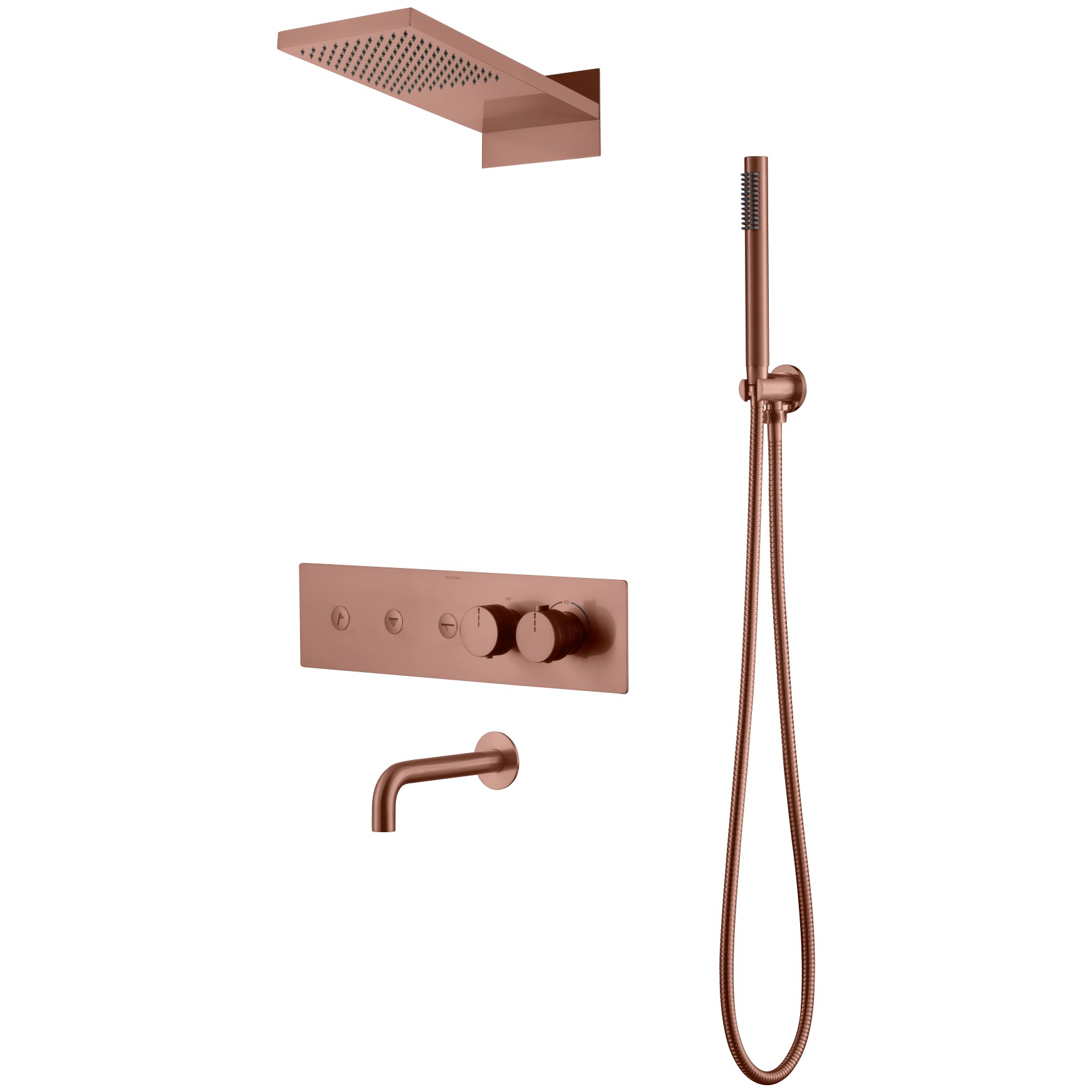 Душевая система скрытого монтажа FUSION. Ультраплоский минималистичный дизайн. Инновационное управление режимами. Термостатический картридж. Форсунки Anticalc. В комплекте: смеситель, монтажная коробка, ручной душ, верхний душ, излив.