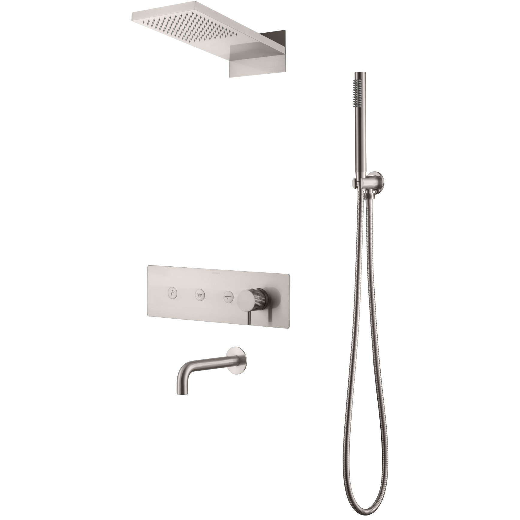Душевая система скрытого монтажа FUSION - ультраплоский минималистичный дизайн. Инновационное управление режимами. Форсунки Anticalc. В комплекте: смеситель, монтажная коробка, ручной душ, верхний душ, излив.