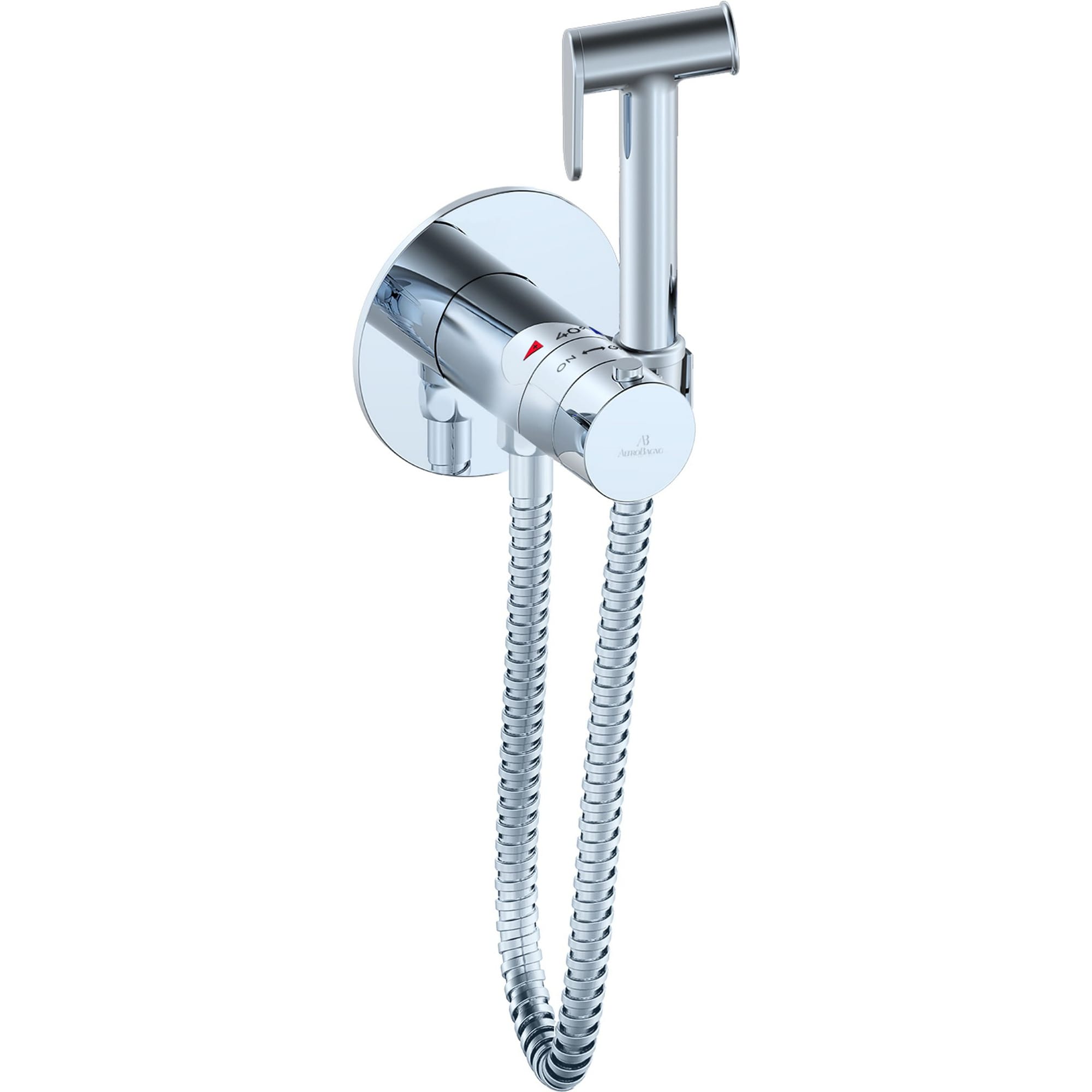 Термостатический смеситель с прогрессивным управлением, плавная регулировка потока воды, шланг 120 см. Комплектация: встраиваемая часть, термостатический смеситель, гигиеническая лейка, гибкий металлический шланг, декоративная панель.