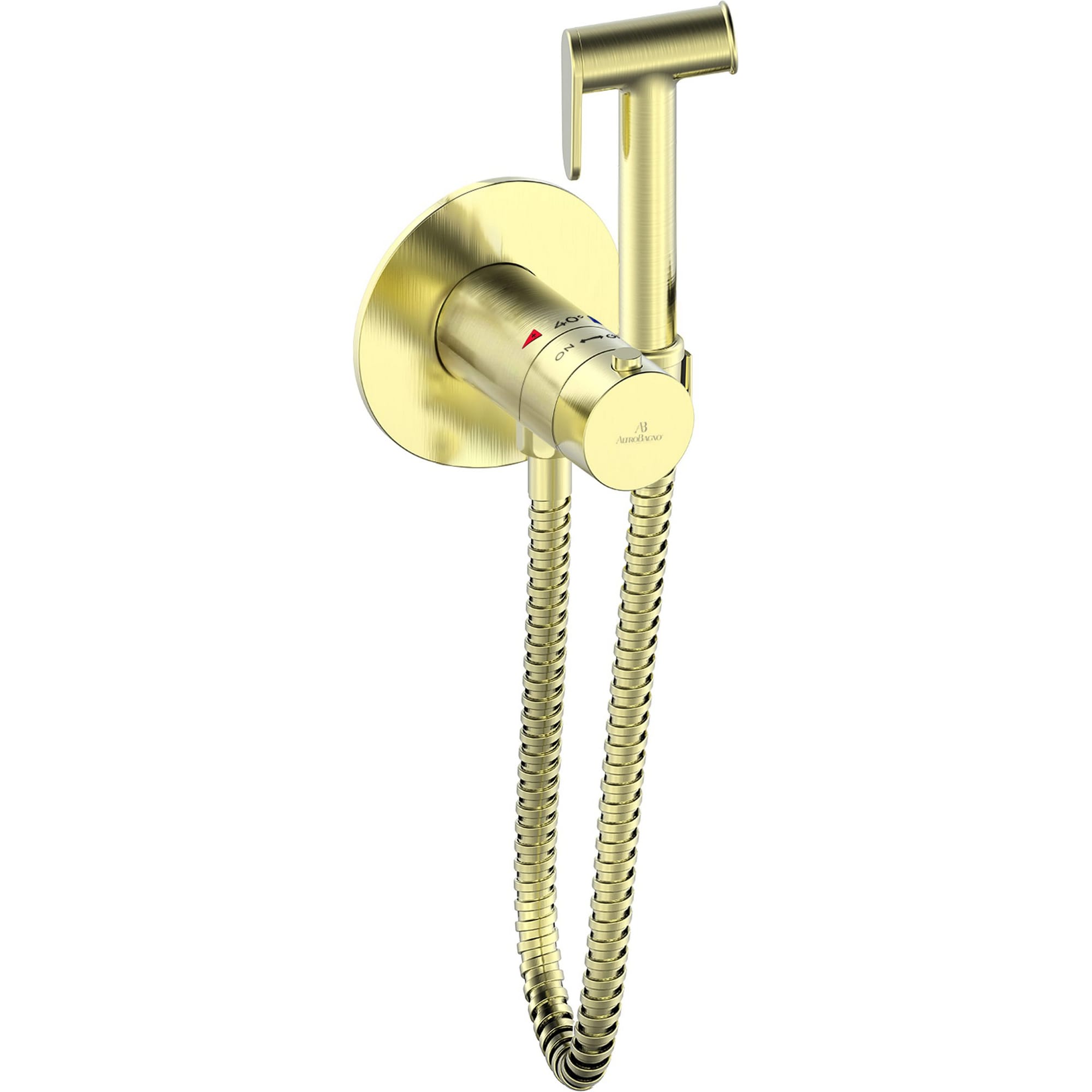 Термостатический смеситель с прогрессивным управлением, плавная регулировка потока воды, шланг 120 см. Комплектация: встраиваемая часть, термостатический смеситель, гигиеническая лейка, гибкий металлический шланг, декоративная панель.