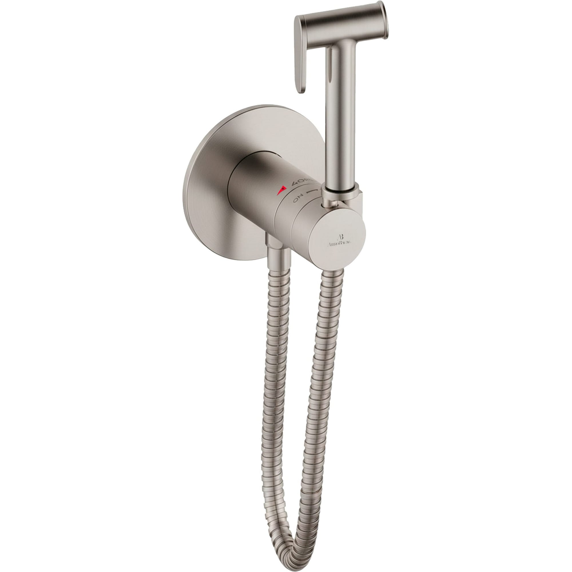 Термостатический смеситель с прогрессивным управлением, плавная регулировка потока воды, шланг 120 см. Комплектация: встраиваемая часть, термостатический смеситель, гигиеническая лейка, гибкий металлический шланг, декоративная панель.