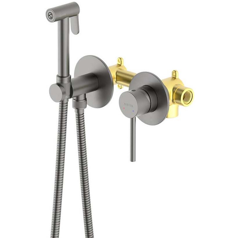 Комплект поставки: смеситель для гигиенического душа (внешняя и скрытая часть), душевой гарнитур: гигиеническая лейка, шланг, шланговое подсоединение с держателем, декоративные накладки на стену из нержавеющей стали 4 мм.