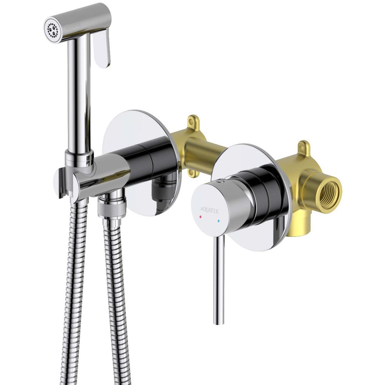 Комплект поставки: смеситель для гигиенического душа (внешняя и скрытая часть), душевой гарнитур: гигиеническая лейка, шланг, шланговое подсоединение с держателем, декоративные накладки на стену из нержавеющей стали 4 мм.