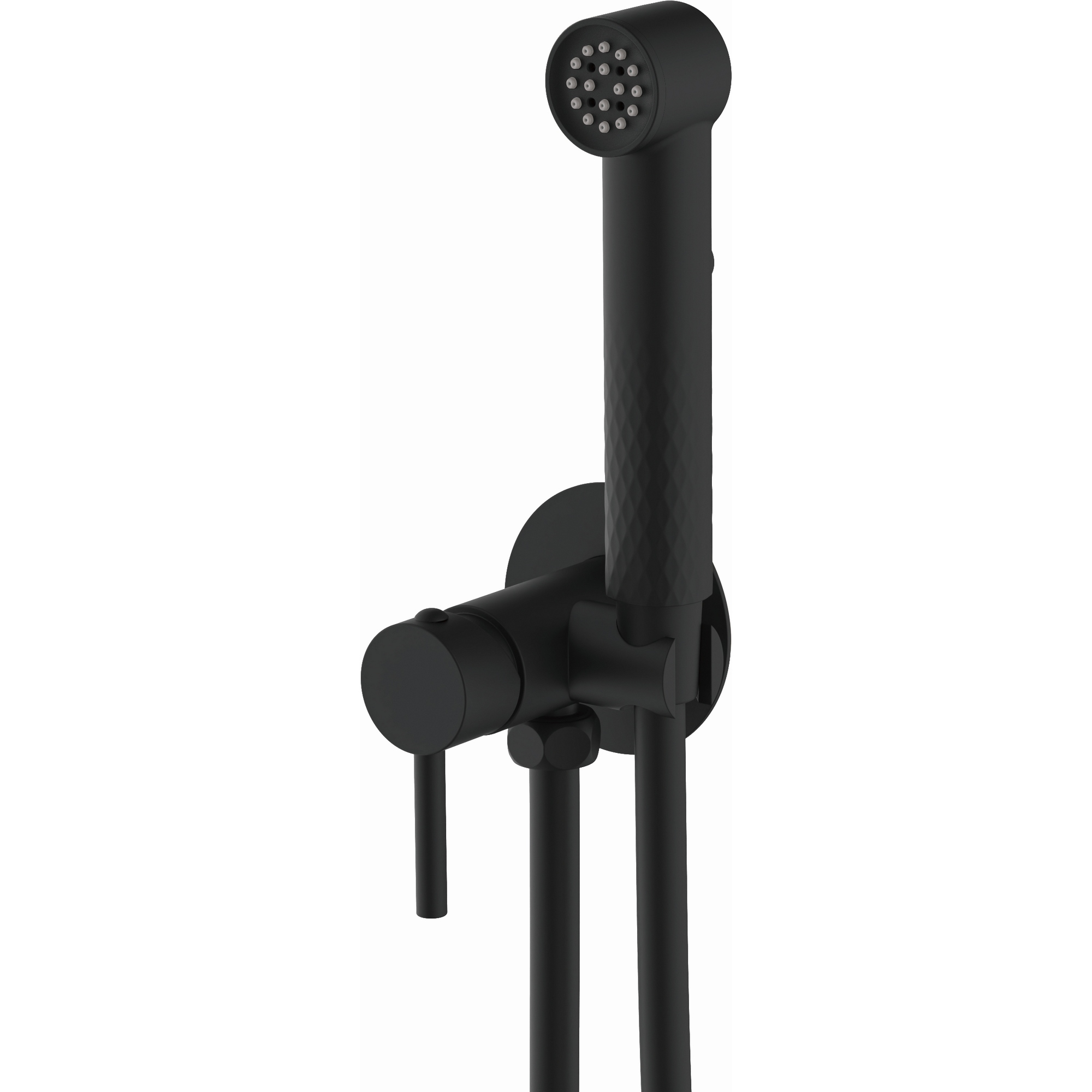 Материал – латунь. Цвет – черный. Керамический картридж. Взрывозащищенный шланг 1.2 м. Гигиеническая лейка 1 режим с клавишей регулировки воды.