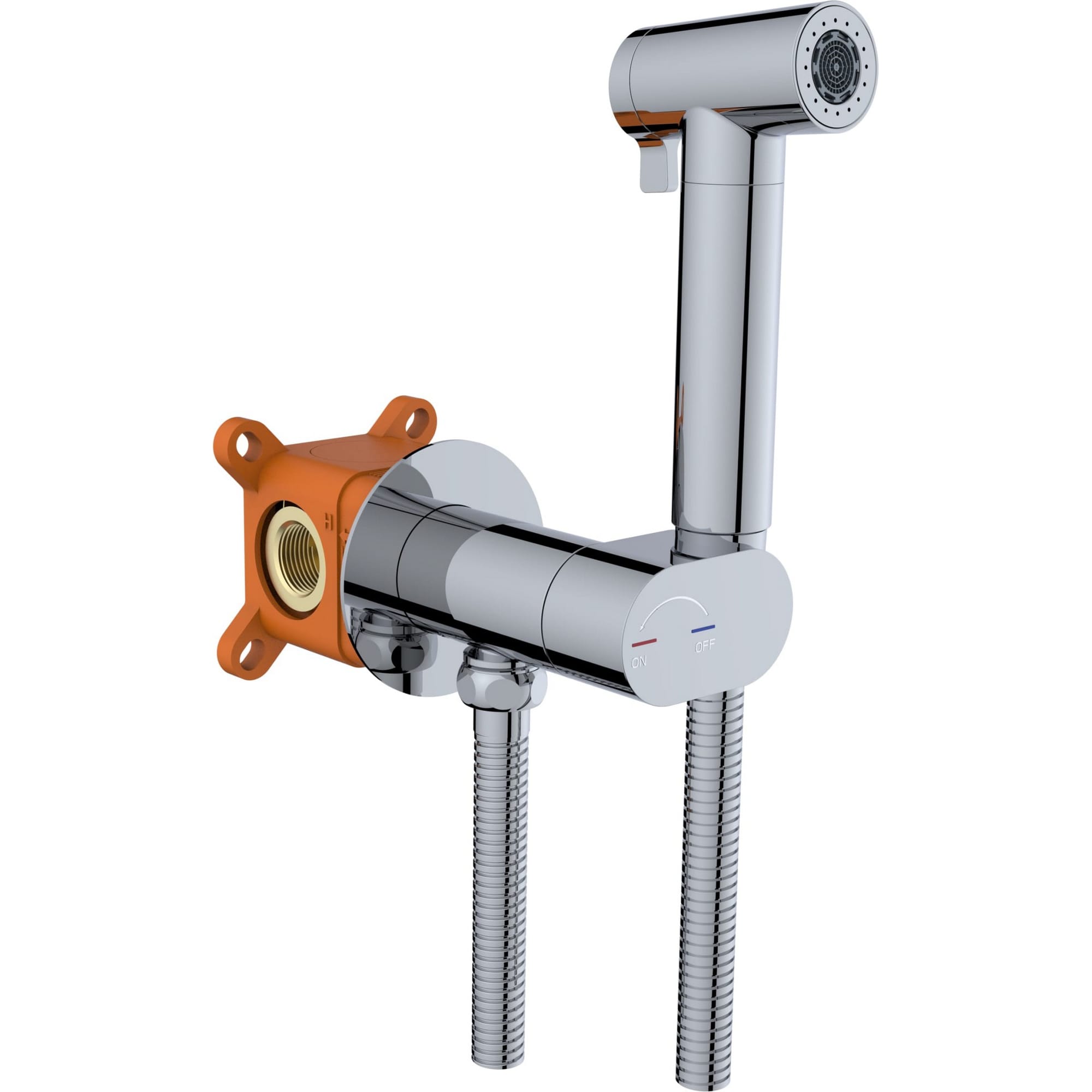Прогрессивный картридж. В комплекте: встраиваемая часть, смеситель, гигиеническая лейка, гибкий металлический шланг, декоративная панель.