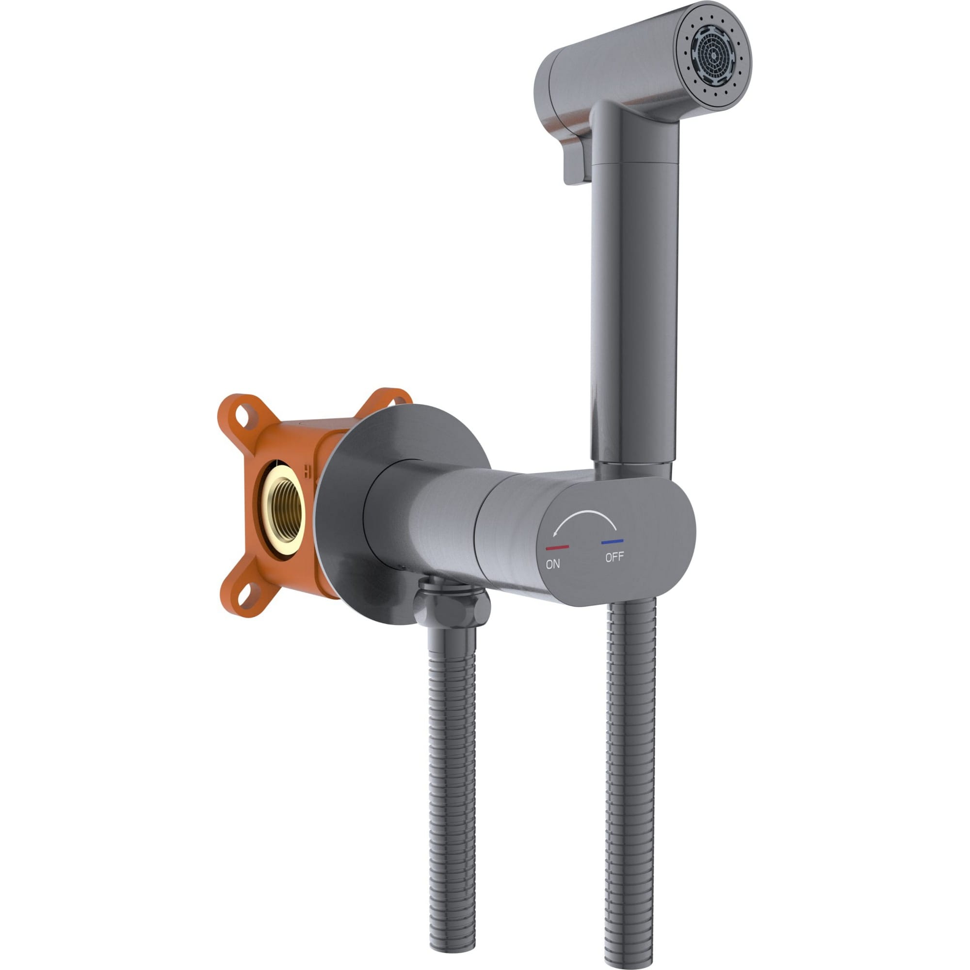 Прогрессивный картридж. В комплекте: встраиваемая часть, смеситель, гигиеническая лейка, гибкий металлический шланг, декоративная панель.