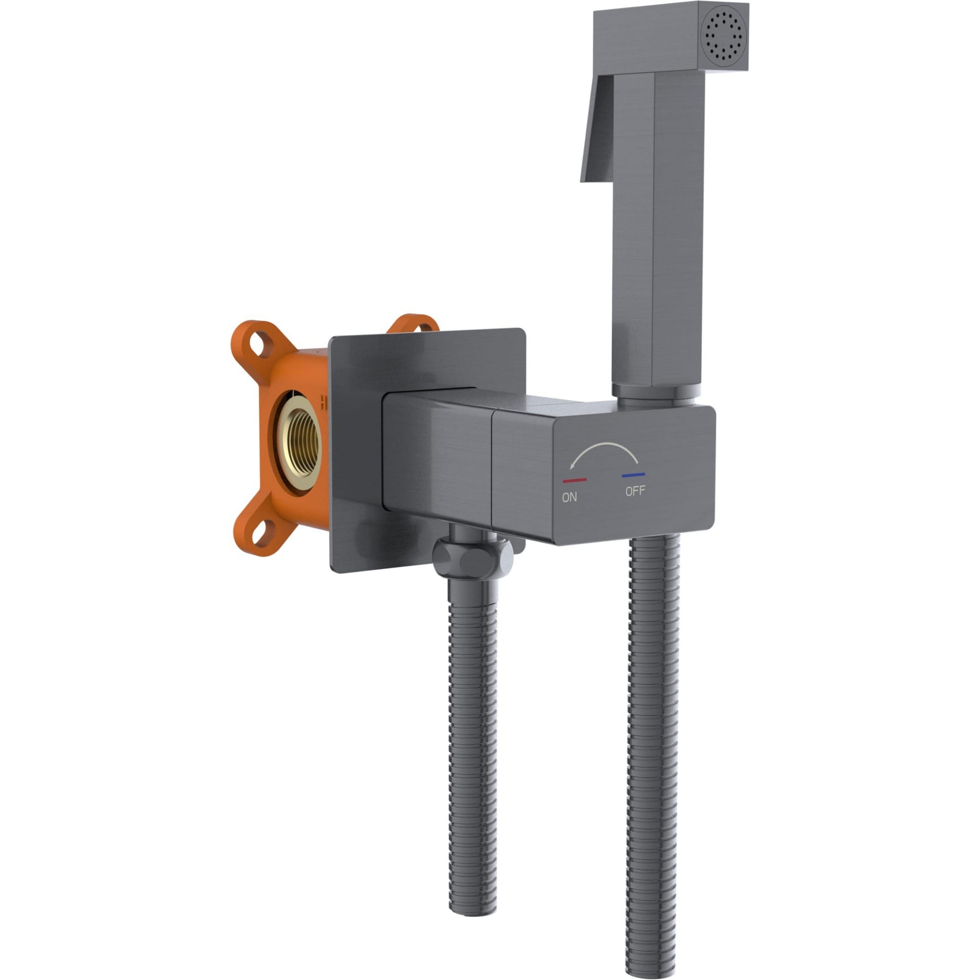 В комплекте: встраиваемая часть, смеситель, гигиеническая лейка, гибкий металлический шланг, декоративная панель.