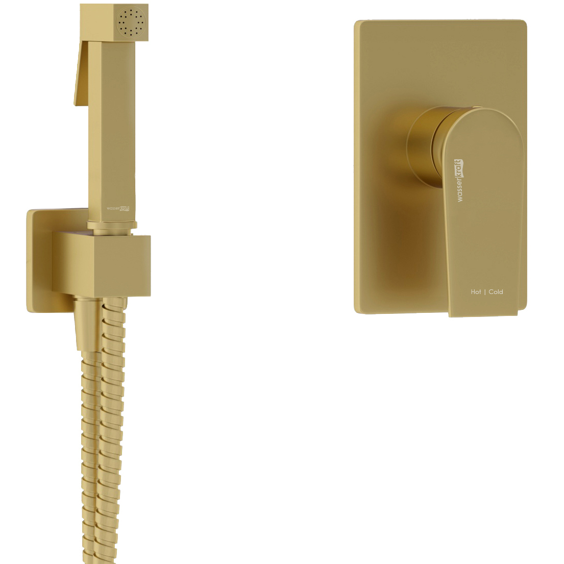 Керамический картридж 35 мм, Sedal (Испания). Комплект скрытого монтажа. Наружная часть смесителя. Силиконовые форсунки с системой защиты от известковых отложений. Входит в комплект: смеситель для душа Aisch 5551, подключение шланга A184, шланг для душа 1500 мм A194, гигиеническая лейка с фиксатором A213. Материал: латунь. Покрытие: PVD-покрытие "матовое золото".
