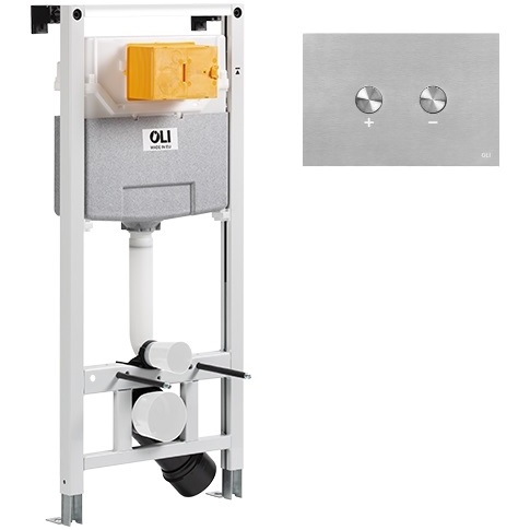 Комплект состоит из: cистема инсталляции OLI 120 Plus пневматическая 885055, кнопка смыва пневматическая OLI Blink 154963 глянцевый хром - ультратонкий металл.