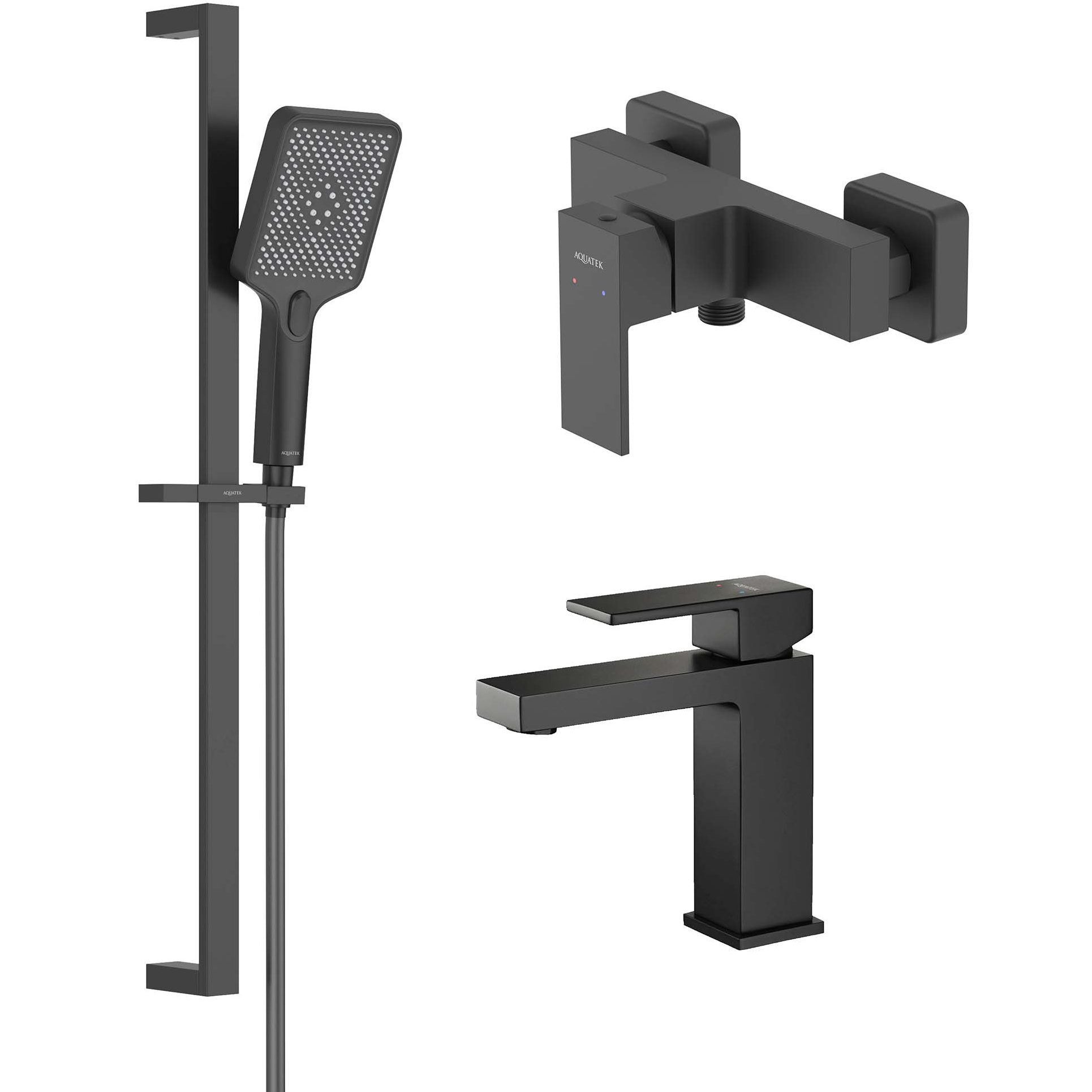 Смеситель для раковины. Смеситель для душа. Душевой гарнитур: душевая стойка с мыльницей, лейка, шланг.