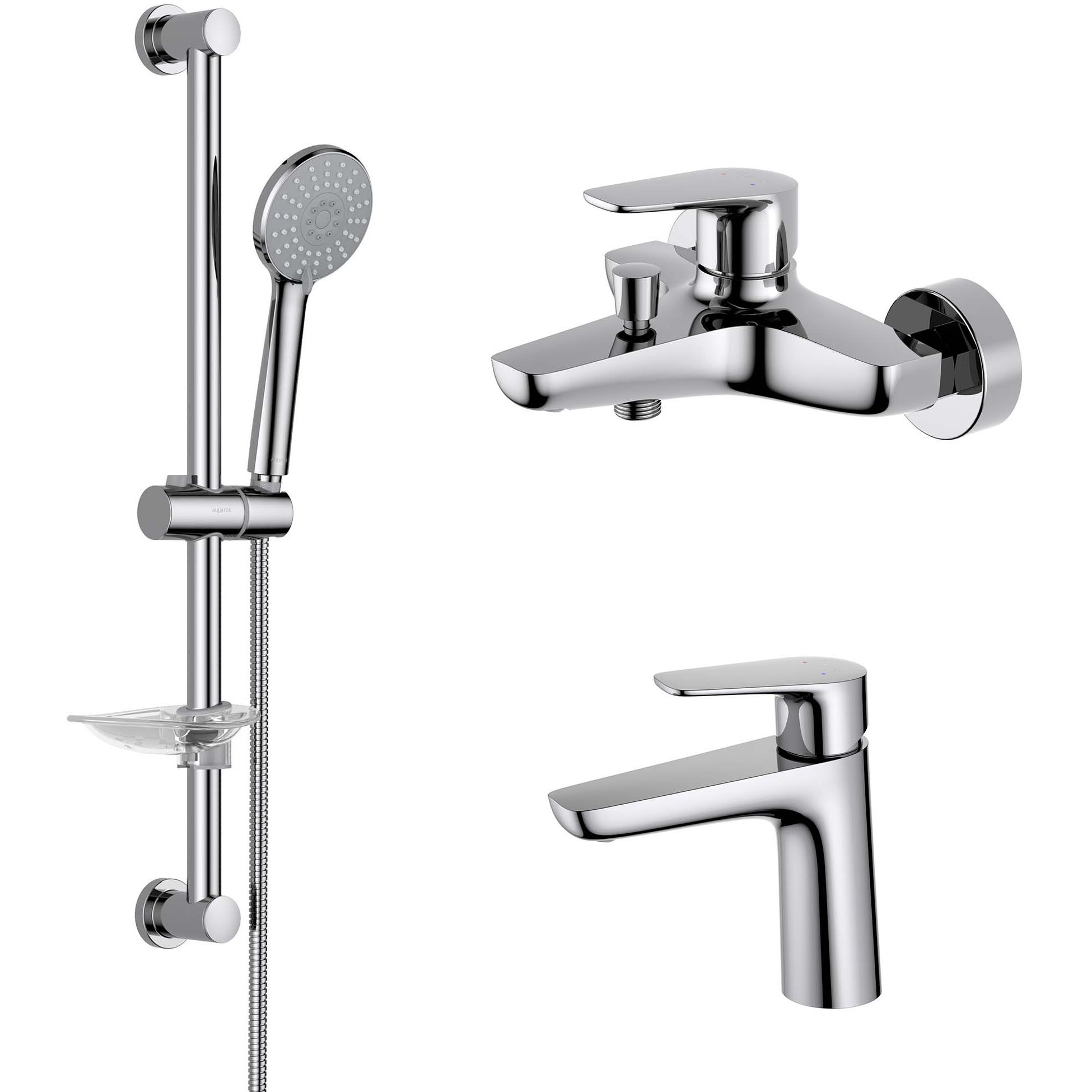 Смеситель для раковины. Смеситель для ванны. Душевой гарнитур: душевая стойка с мыльницей, лейка, шланг.