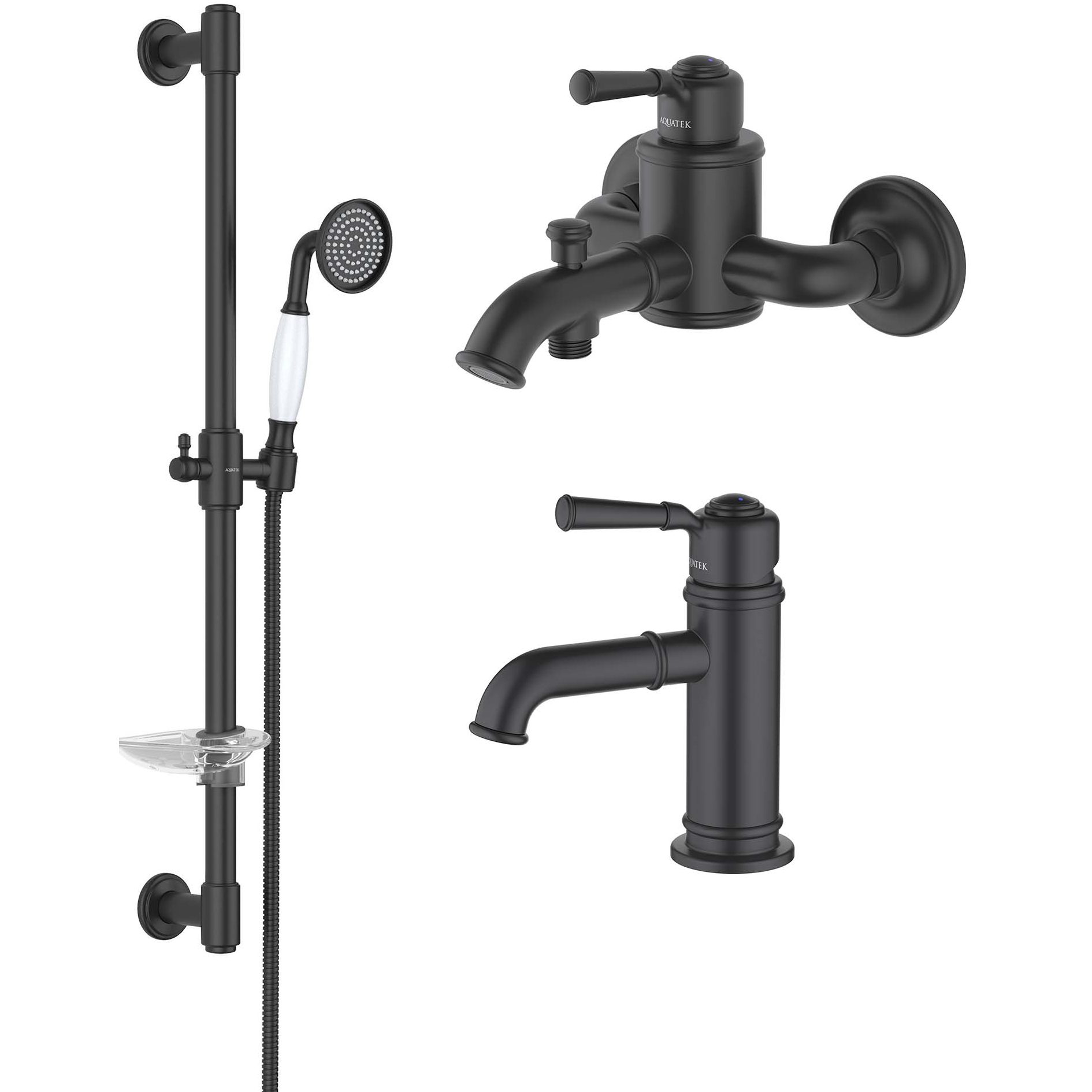 Смеситель для раковины. Смеситель для ванны. Душевой гарнитур: душевая стойка с мыльницей, лейка, шланг.