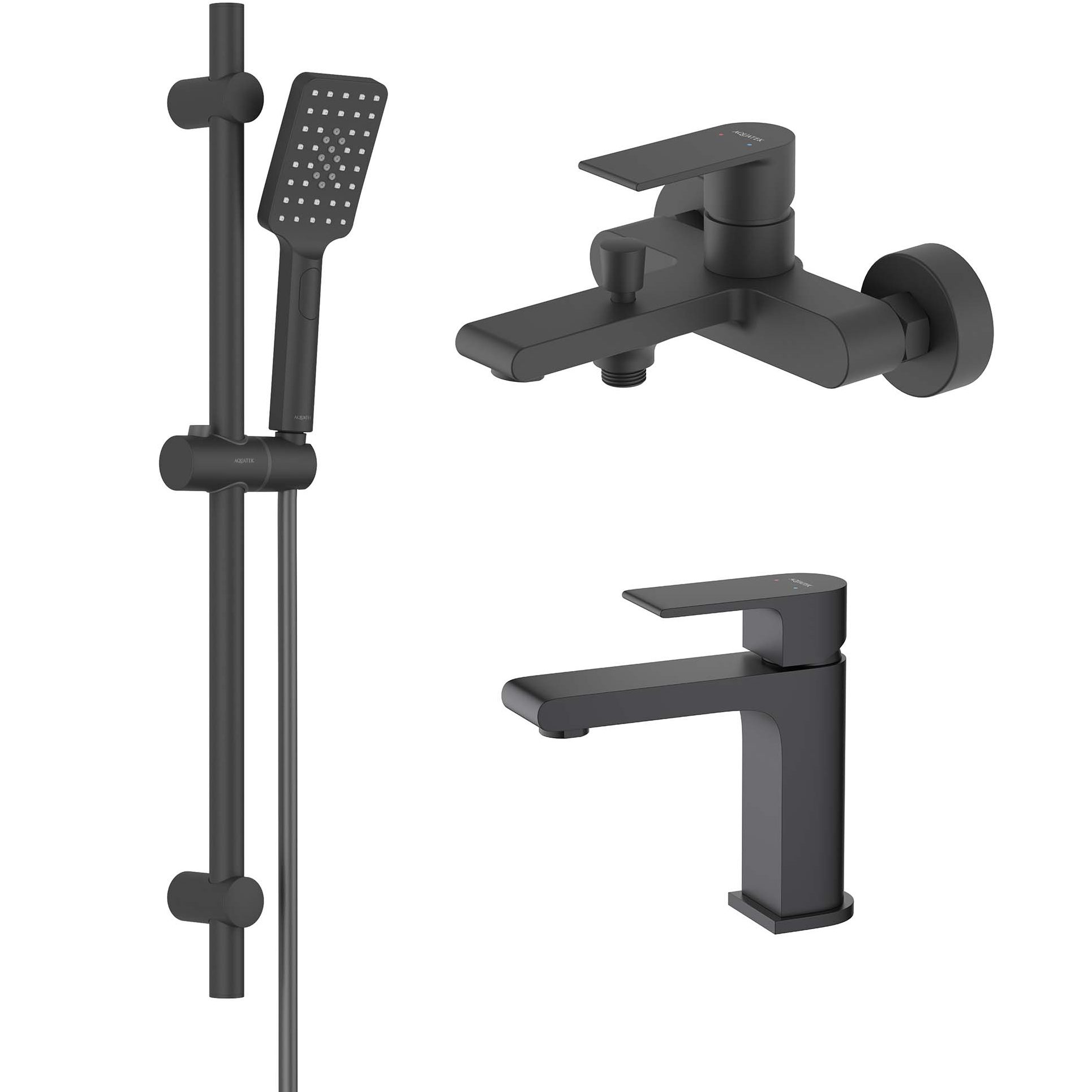 Смеситель для раковины. Смеситель для ванны. Душевой гарнитур: душевая стойка, лейка, шланг.