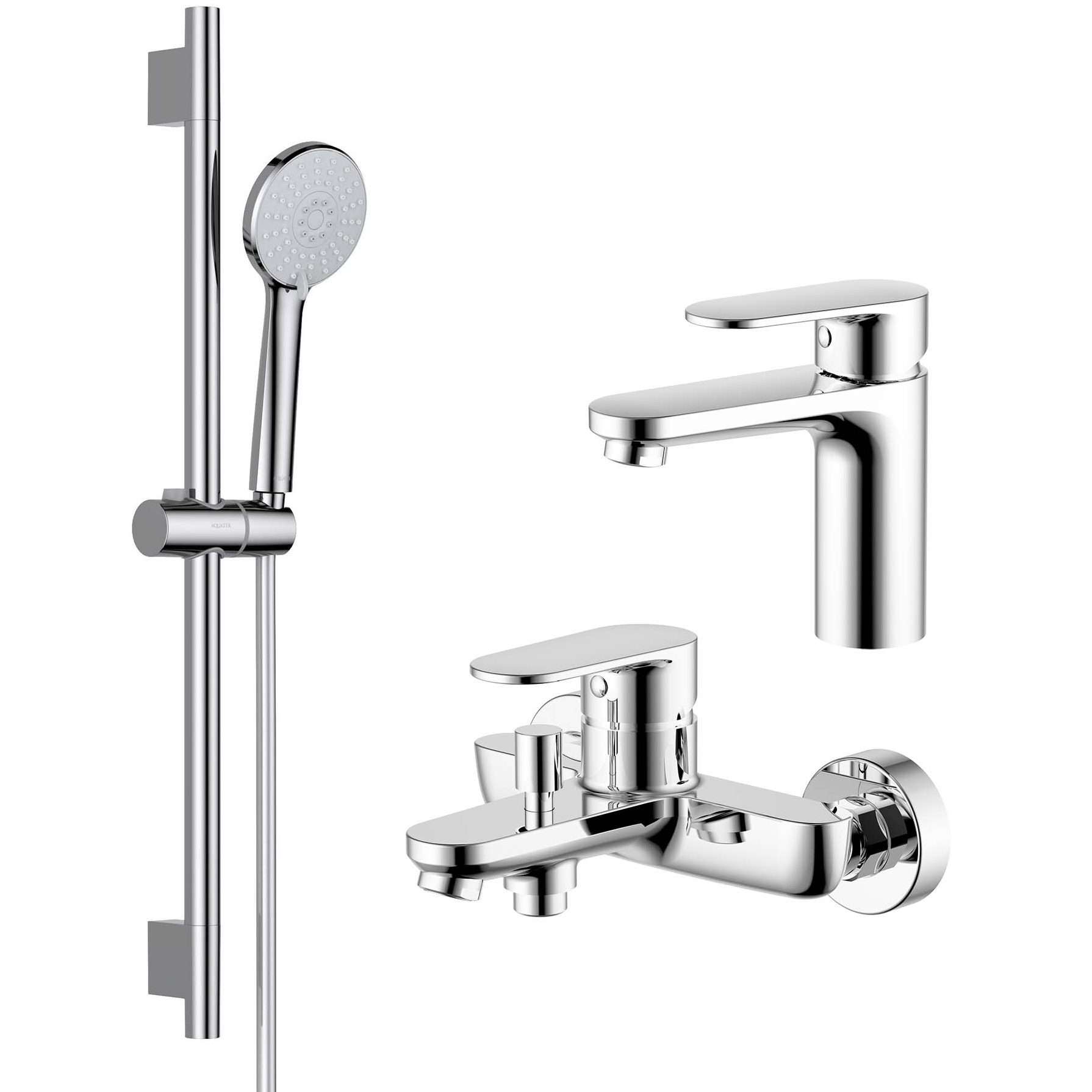 Смеситель для раковины. Смеситель для ванны. Душевой гарнитур: душевая стойка, лейка, шланг.