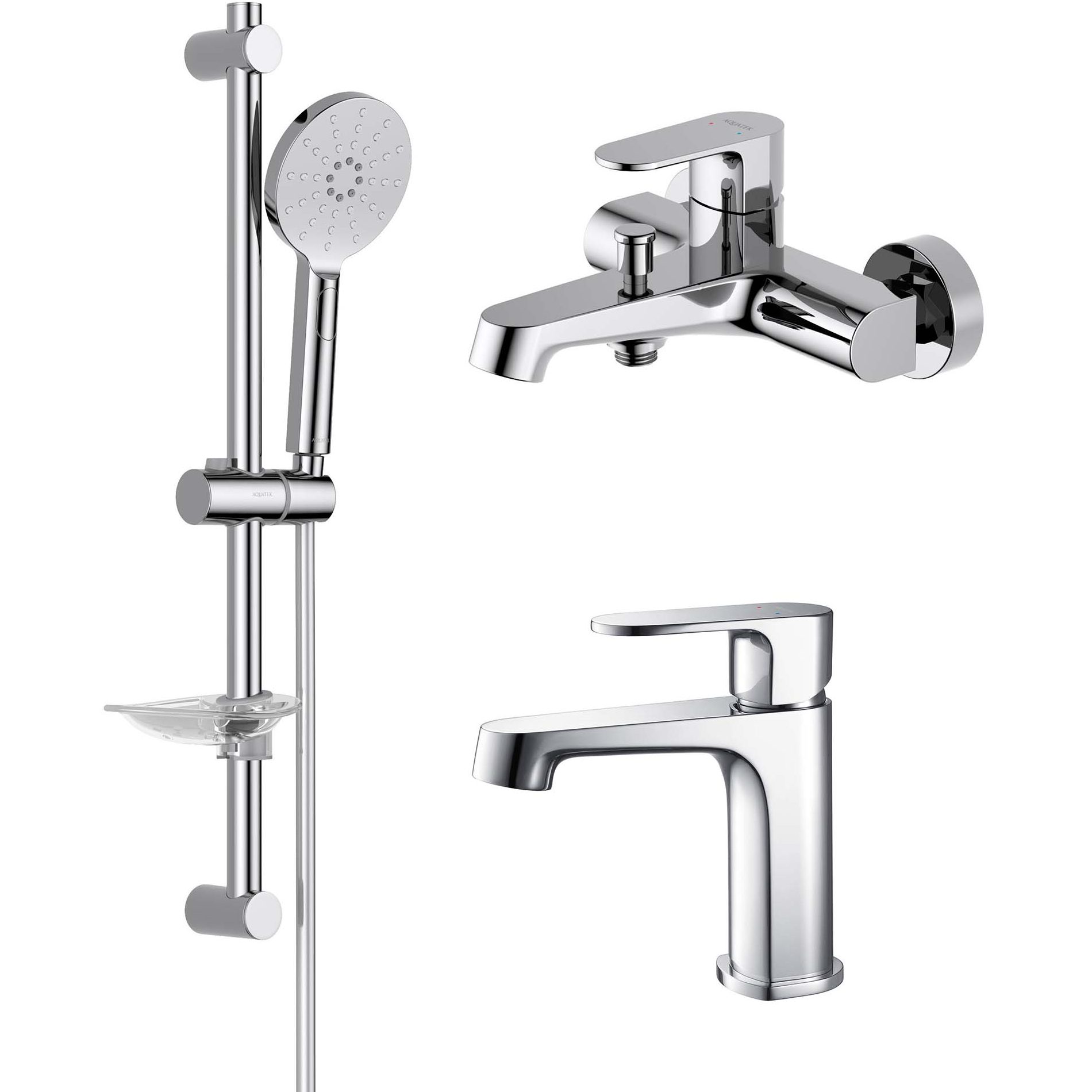 Смеситель для раковины. Смеситель для ванны. Душевой гарнитур: душевая стойка с мыльницей, лейка, шланг.