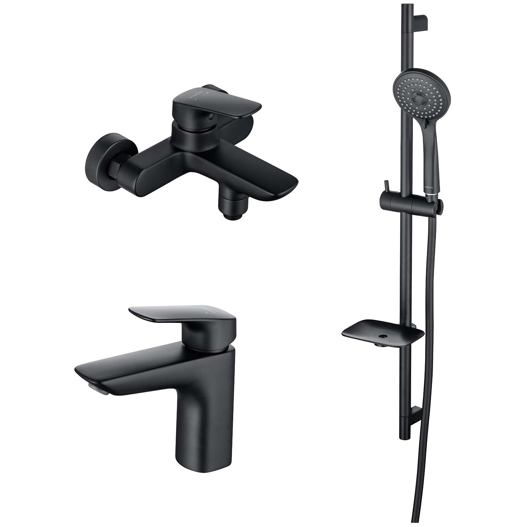 Смеситель для раковины. Смеситель для ванны. Душевой гарнитур: душевая стойка с мыльницей, лейка, шланг.