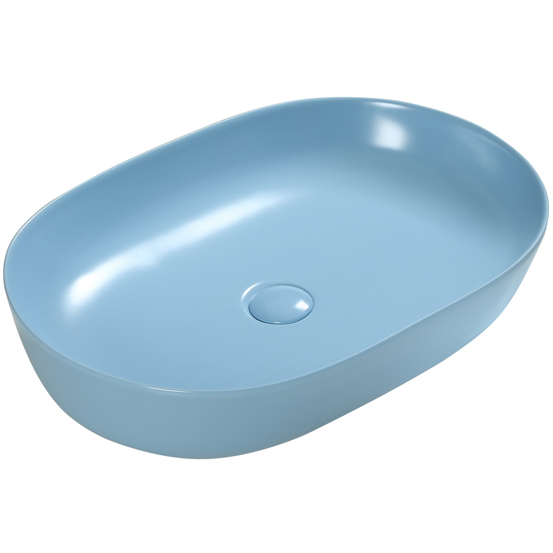 Раковина керамическая, голубая матовая накладная. Размер 60,5x41,8x13,5 см. Донный клапан в комплекте.