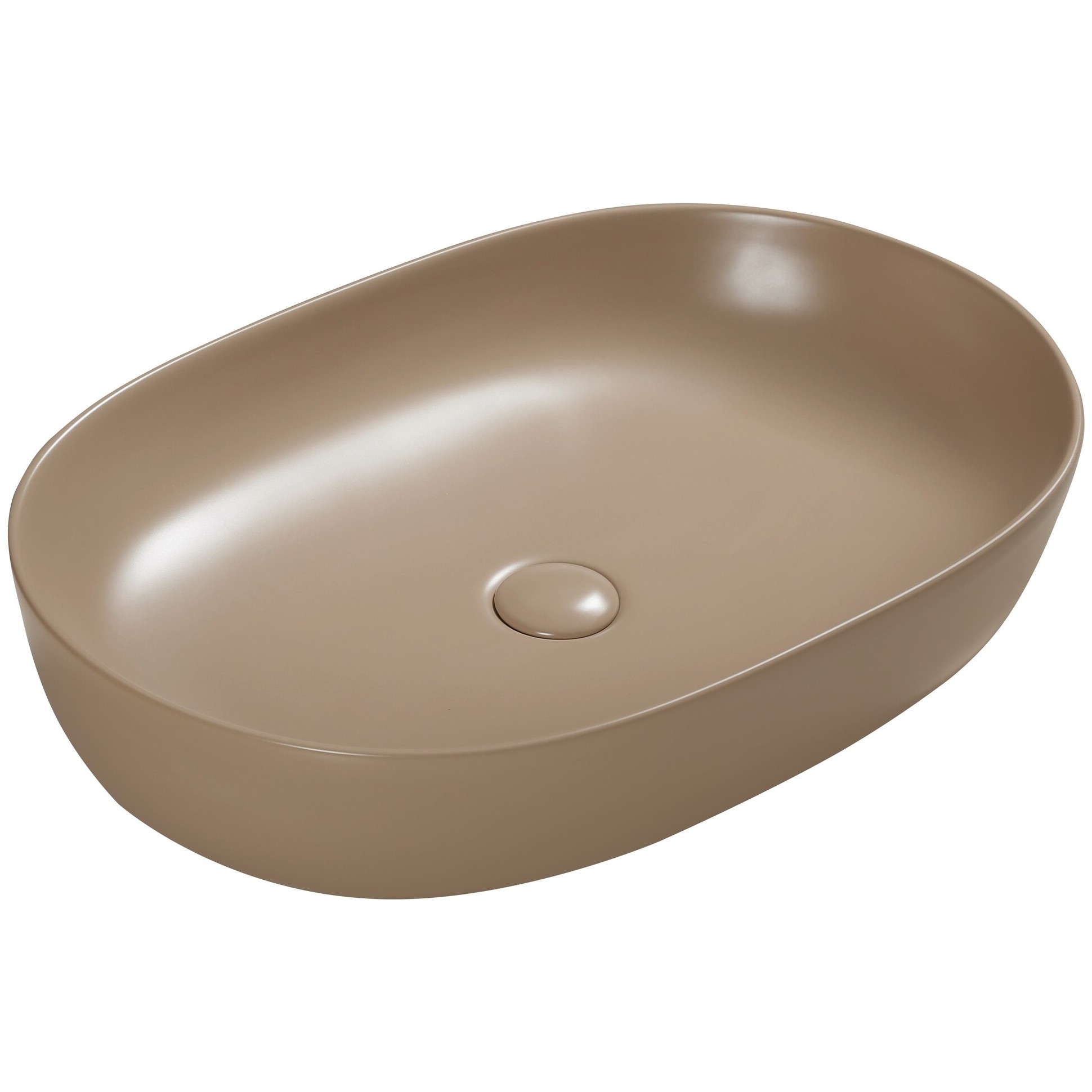 Раковина керамическая, светло-коричневая матовая накладная. Размер 60,5x41,8x13,5 см. Донный клапан в комплекте.