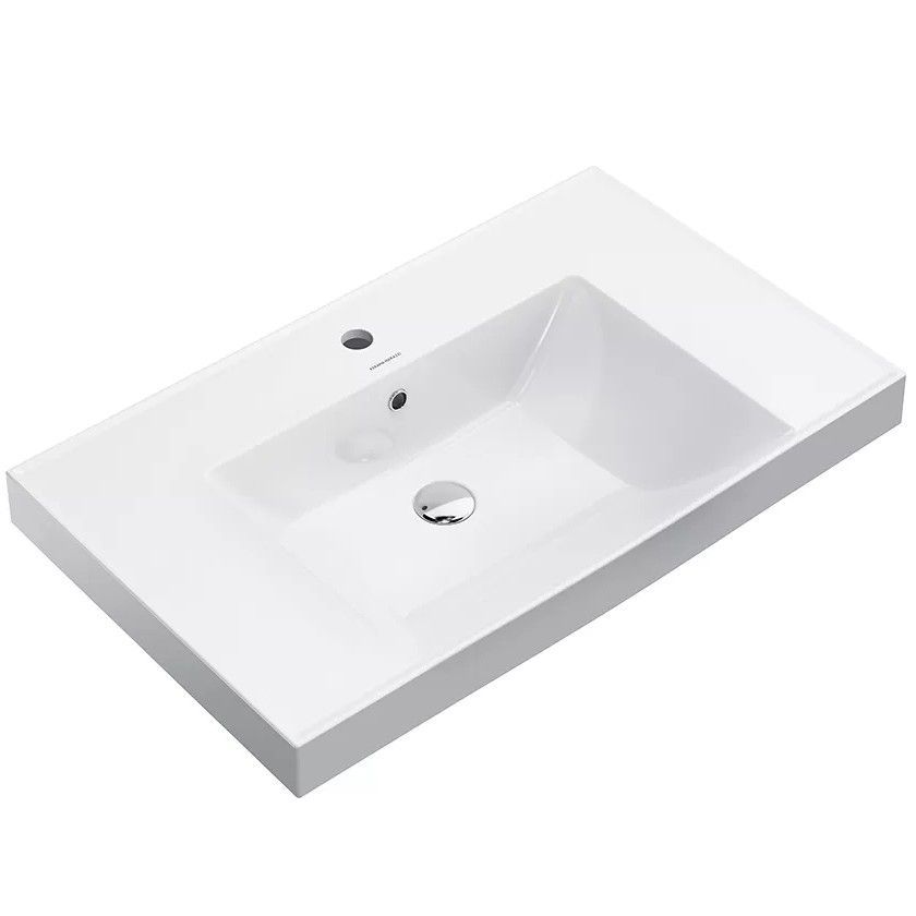 Белая глянцевая мебельная раковина с удобной площадкой для предметов и отверстием под смеситель, ширина 70/80/100 см. Чаша раковины расположена в центре, с отверстием слив/перелив. Возможна подвеска раковины на стену без тумбы (крепления входят в комплект). Донный клапан в комплект не входит.