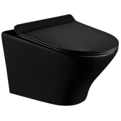 Подвесной унитаз с безободковой системой слива, сиденье из дюропласта с плавным опусканием, быстросъемное, металлические накладки, металлический крепеж на петлях.