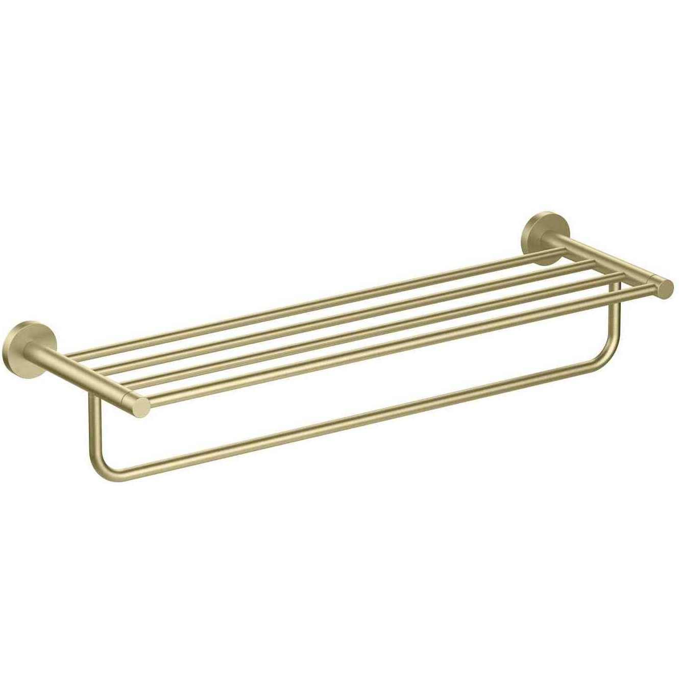 Основной материал: латунь, нержавеющая сталь. Монтаж: на стену. Метод крепления: шурупы. Легкая установка. В комплекте: полка с держателем для полотенец, монтажный комплект.