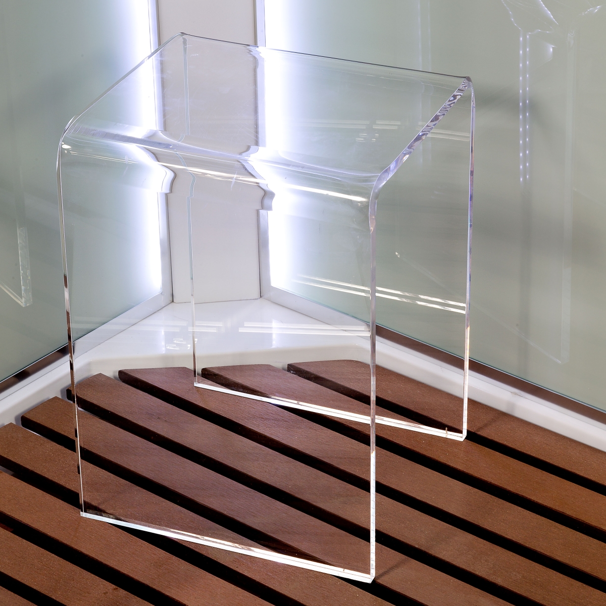 Стул для душевой кабины. Материал: плексиглас. Длина: 30 см. Ширина: 27 см. Высота: 40 см.