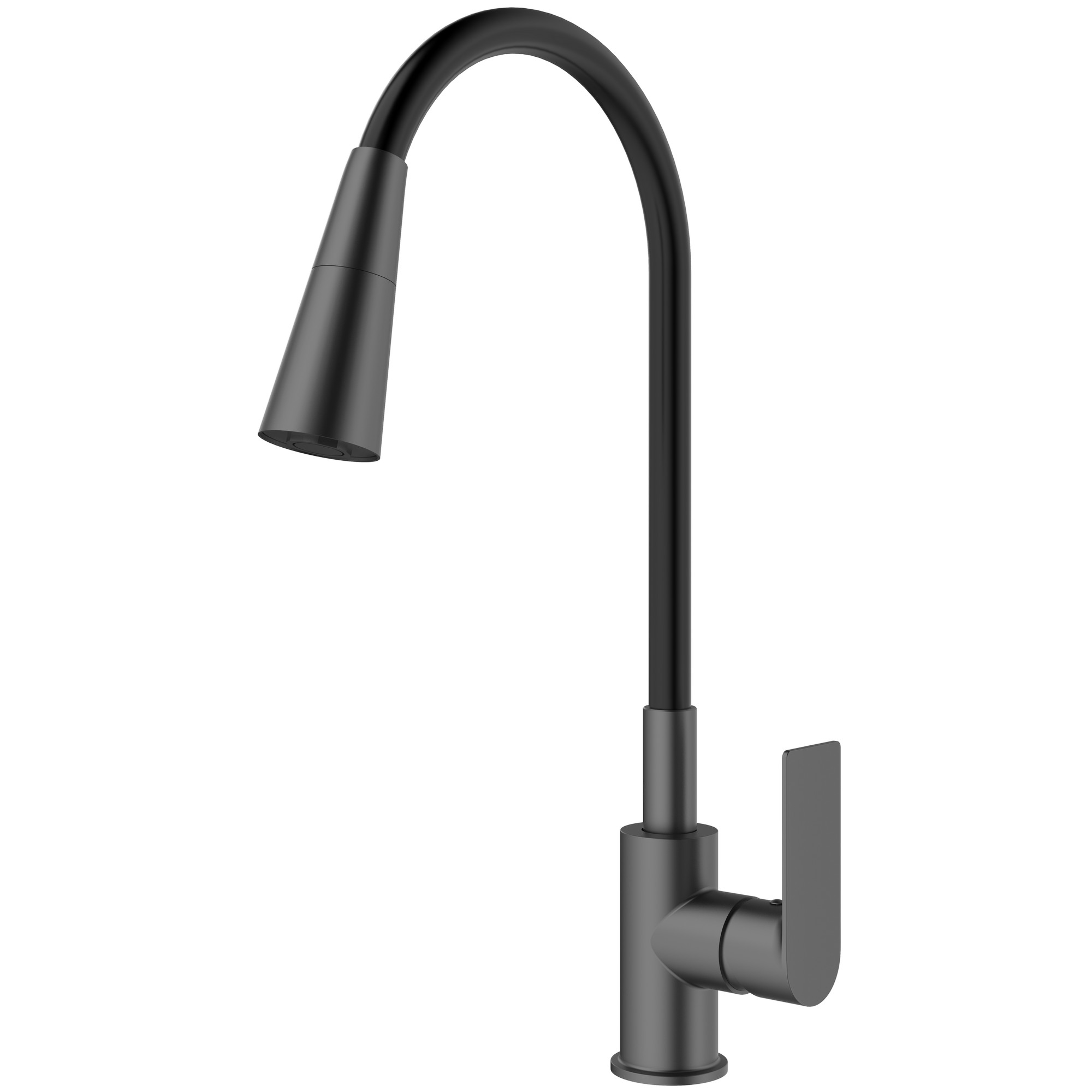 Материал – латунь. Цвет – графит + черный. Керамический картридж. Гибкий силиконовый излив. Аэратор 2 режима. Гибкая подводка 50 см. Крепежная гайка.