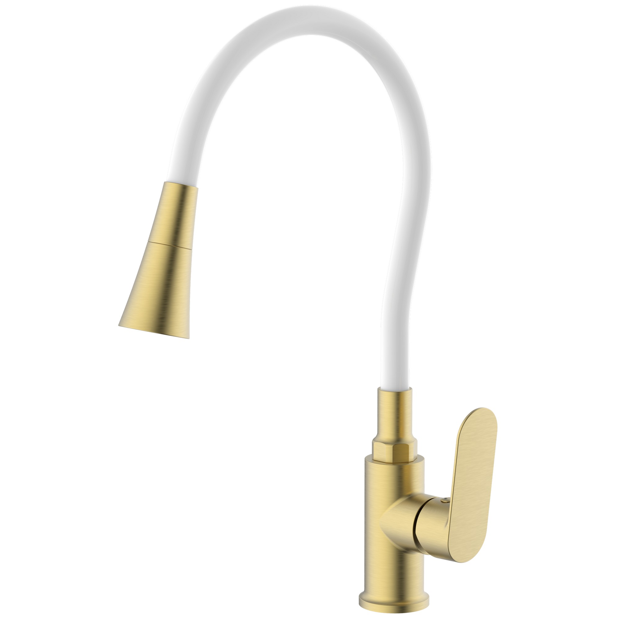 Материал – латунь. Цвет – золотой сатин + белый. Керамический картридж. Гибкий силиконовый излив. Аэратор 2 режима. Гибкая подводка 50 см. Крепежная гайка.