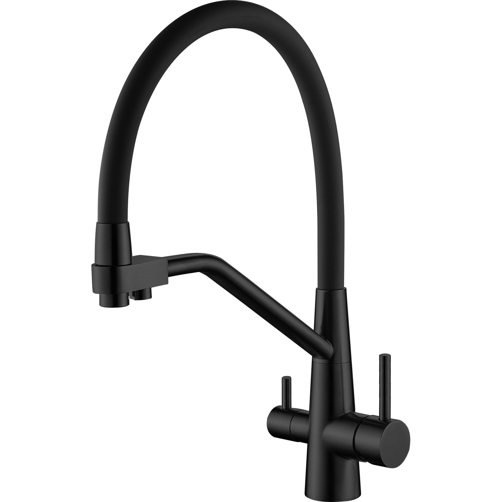 Материал – нержавеющая сталь. Цвет – черный. Магнитный фиксатор. Керамический картридж. Переключатель с керамическими пластинами. Аэратор. Аэратор для фильтрованной воды. Переходник для соединения со стационарной системой питьевой воды. Гибкая подводка 50 см. Крепежная гайка.
