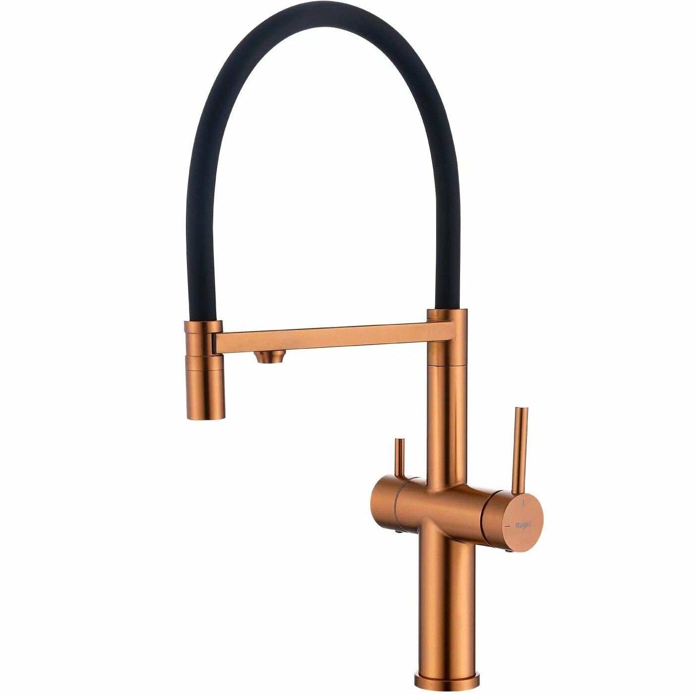 Материал – нержавеющая сталь SUS304. Керамический картридж 35 мм. Переключатель с керамическими пластинами (угол поворота – 90°). Аэратор. Аэратор для фильтрованной воды. Переходник для соединения со стационарной системой питьевой воды. Гибкая подводка 55 см. Крепежная 1 шпилька.