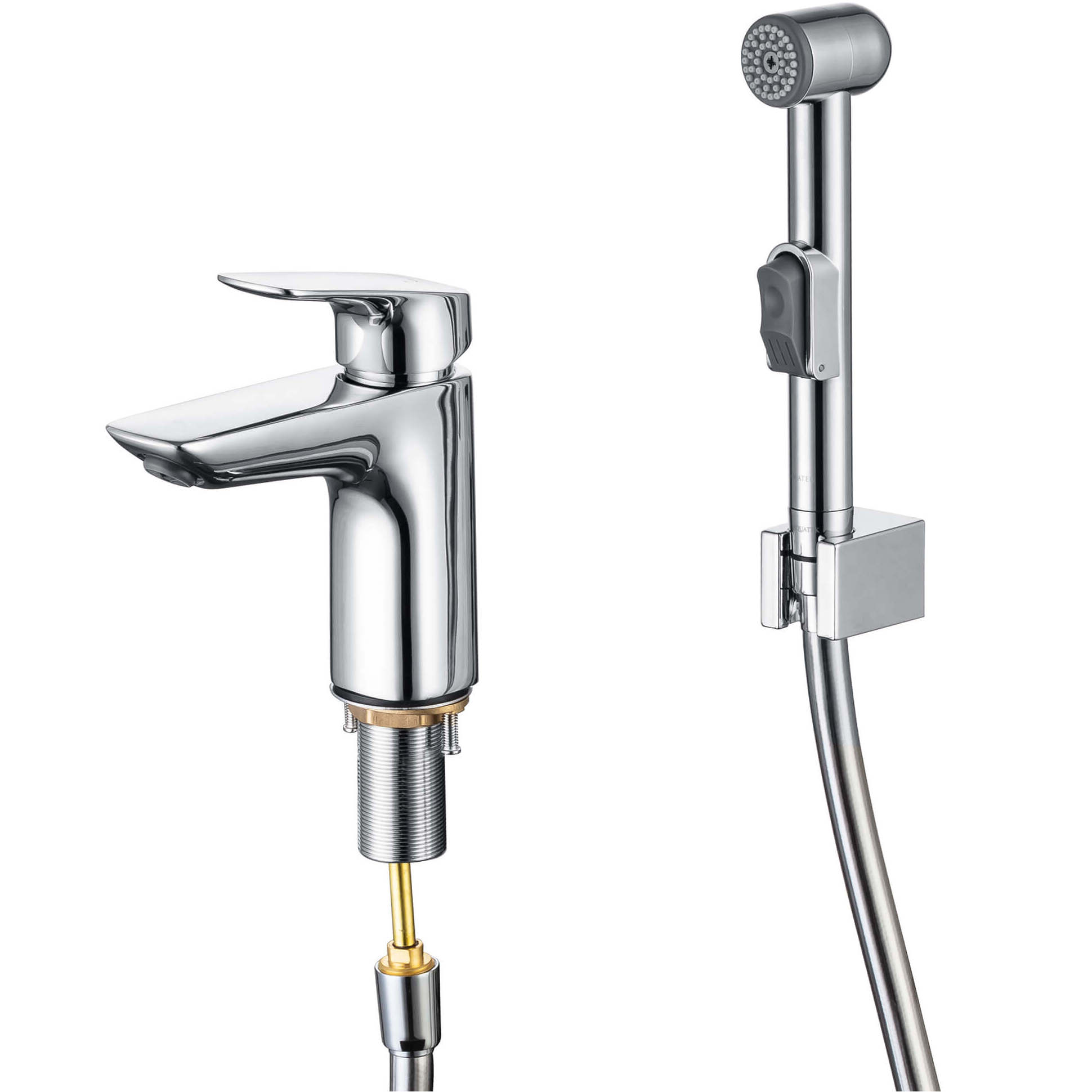 Практичное решение для санузла или для ванной комнаты, совмещенной с санузлом, в которых не предусмотрено отдельное подключение для гигиенического душа. Однорычажная система регулировки силы струи и температуры воды. Цельный корпус смесителя снижает вероятность протечек. Шланг из ПВХ. Легкая очистка аэратора. Оптимальная длина подводки. В комплекте: смеситель, гибкая подводка 50 см, шланг для лейки 150 см, гигиеническая лейка, размер лейки 173x54 мм, оснащена нажимным механизмом для остановки потока воды, настенный держатель для гигиенической лейки, монтажный комплект.