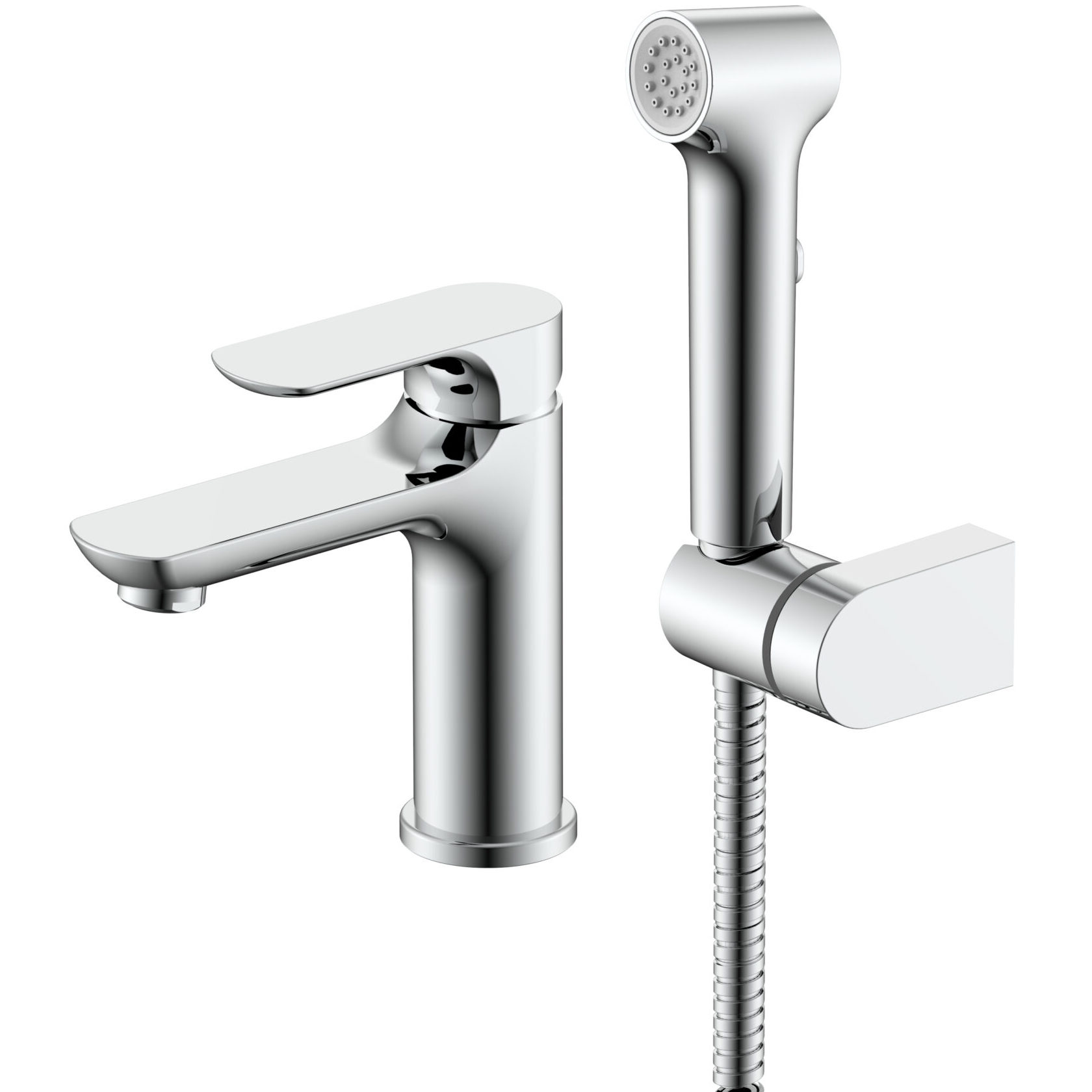 Материал – латунь. Цвет – хром. Керамический картридж 35 мм. Аэратор. Душевой шланг 1.5 м. Гигиеническая лейка с клавишей регулировки воды. Гигиеническая лейка 1 режим. Гибкая подводка 55 см. Крепежная гайка.
