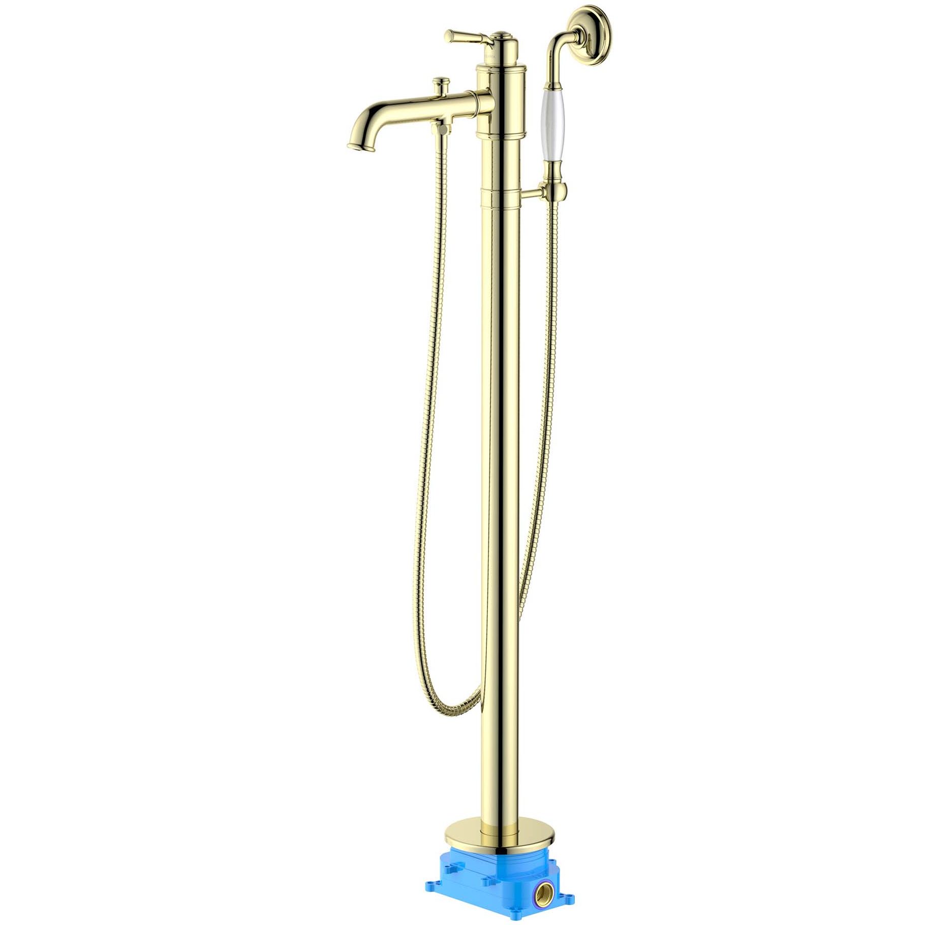 Однорычажная система регулировки силы струи и температуры воды. Цельный корпус смесителя снижает вероятность протечек. Легкая очистка аэратора. Напольный монтаж. В комплекте ручная лейка и шланг 1,5 м. Латунный рычажный переключатель. Шланг с защитой от перекручивания. Комплект поставки: смеситель (внешняя и скрытая часть), ручная лейка, шланг для лейки 150 см, держатель для ручной лейки, дивертор (переключатель потоков), декоративная накладка на пол.