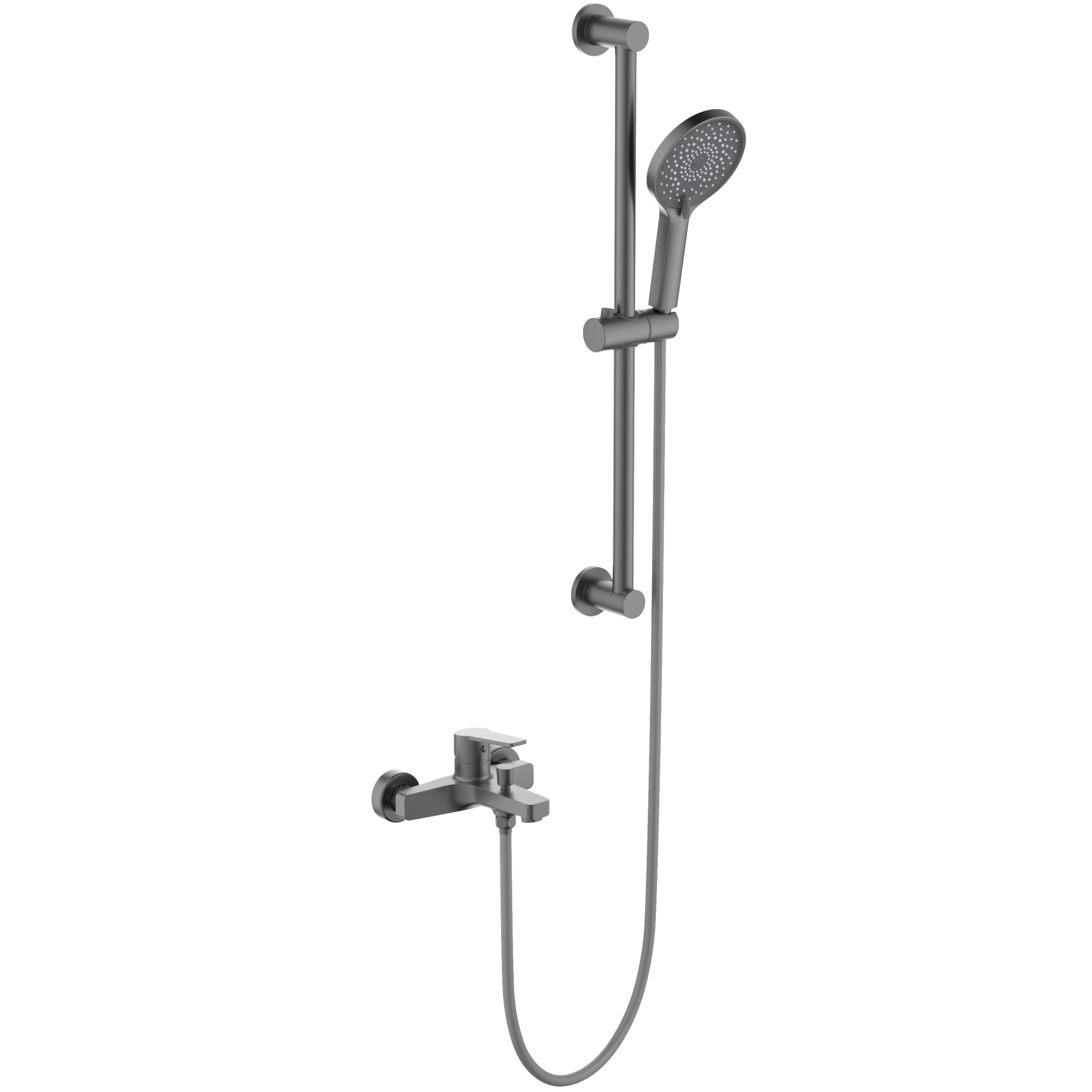 Однорычажная система регулировки силы струи и температуры воды. Цельный корпус смесителя снижает вероятность протечек. Легкая очистка аэратора. Вытяжной переключатель на душ. Ручной душ из пластика на 3 режима. Поворотный держатель ручного душа. Комплект поставки: смеситель, душевой гарнитур (лейка, шланг, настенный держатель для лейки), S-образные эксцентрики, декоративные отражатели.