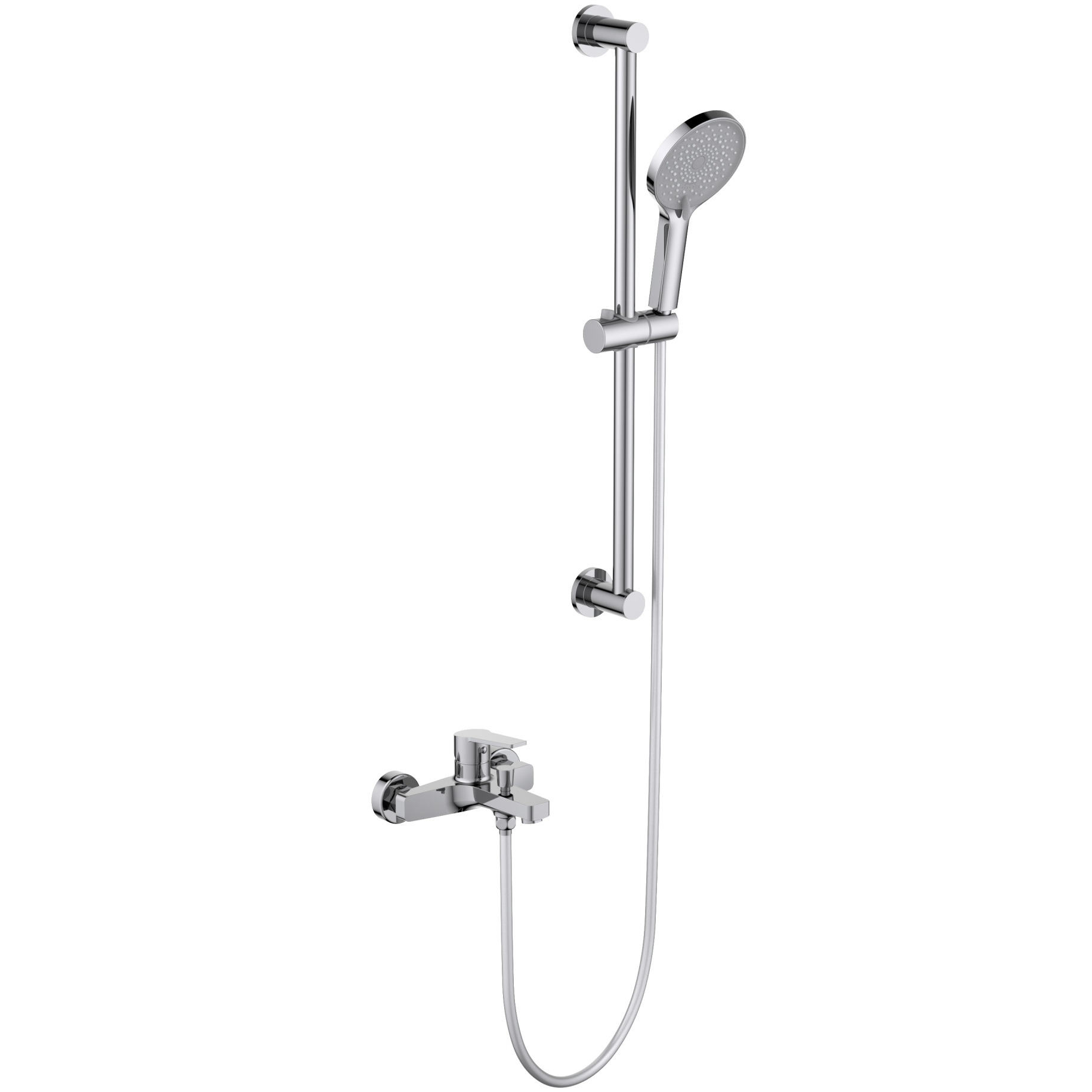 Однорычажная система регулировки силы струи и температуры воды. Цельный корпус смесителя снижает вероятность протечек. Легкая очистка аэратора. Вытяжной переключатель на душ. Ручной душ из пластика на 3 режима. Поворотный держатель ручного душа. Комплект поставки: смеситель, душевой гарнитур (лейка, шланг, настенный держатель для лейки), S-образные эксцентрики, декоративные отражатели.