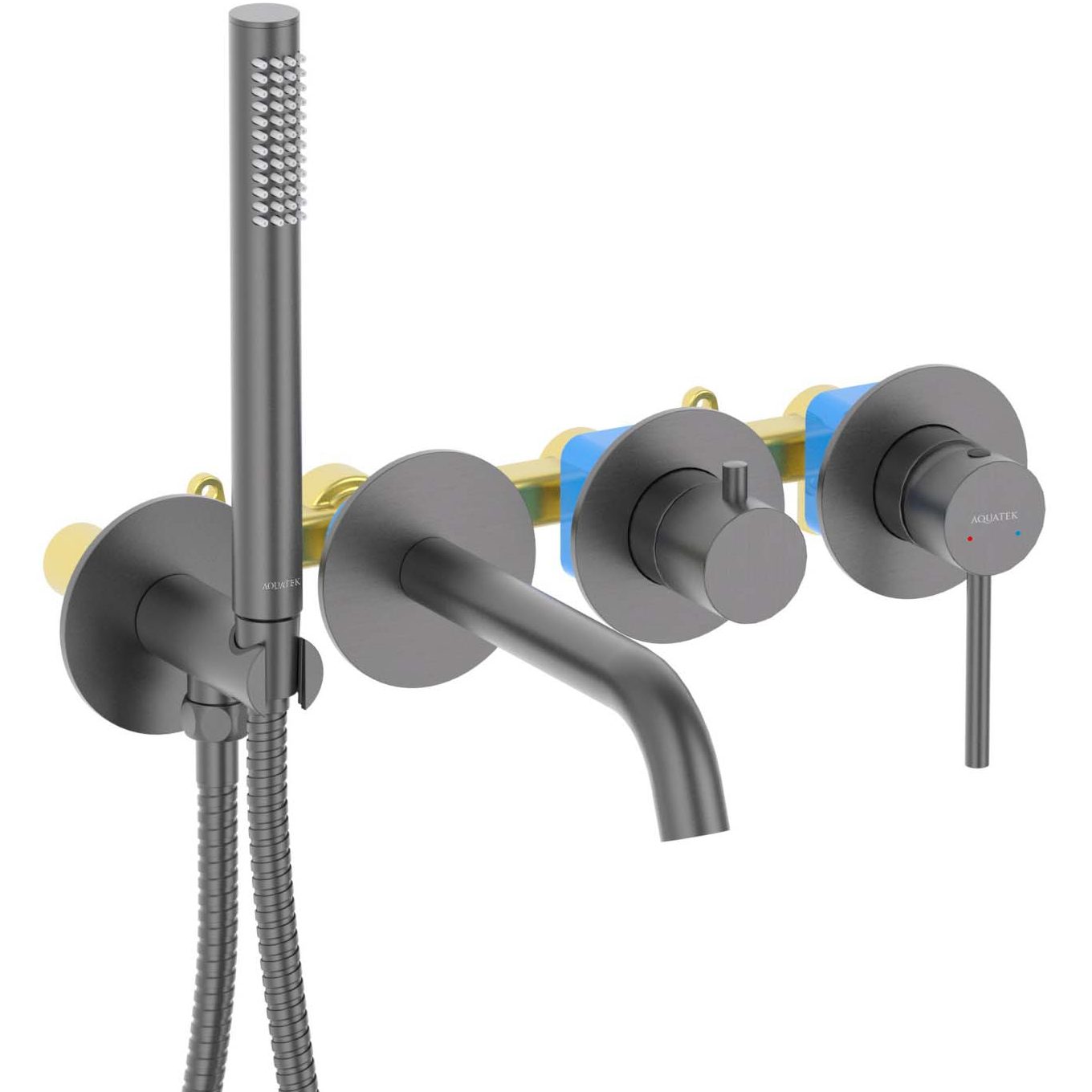 Ручка из цинкового сплава. Латунный излив. Ручной душ из латуни. Оптимальная длина шланга. Шланг 1,5 м с оплеткой из нержавеющей стали. Высококачественные материалы. Стойкое покрытие. Комплект поставки: смеситель из латуни с установочной коробкой на 2 потребителя (внешняя и скрытая часть), излив смесителя, дивертор (переключатель потоков), душевой гарнитур: гигиеническая лейка, шланг 1,5 м, декоративная накладка на стену из нержавеющей стали 4 мм.