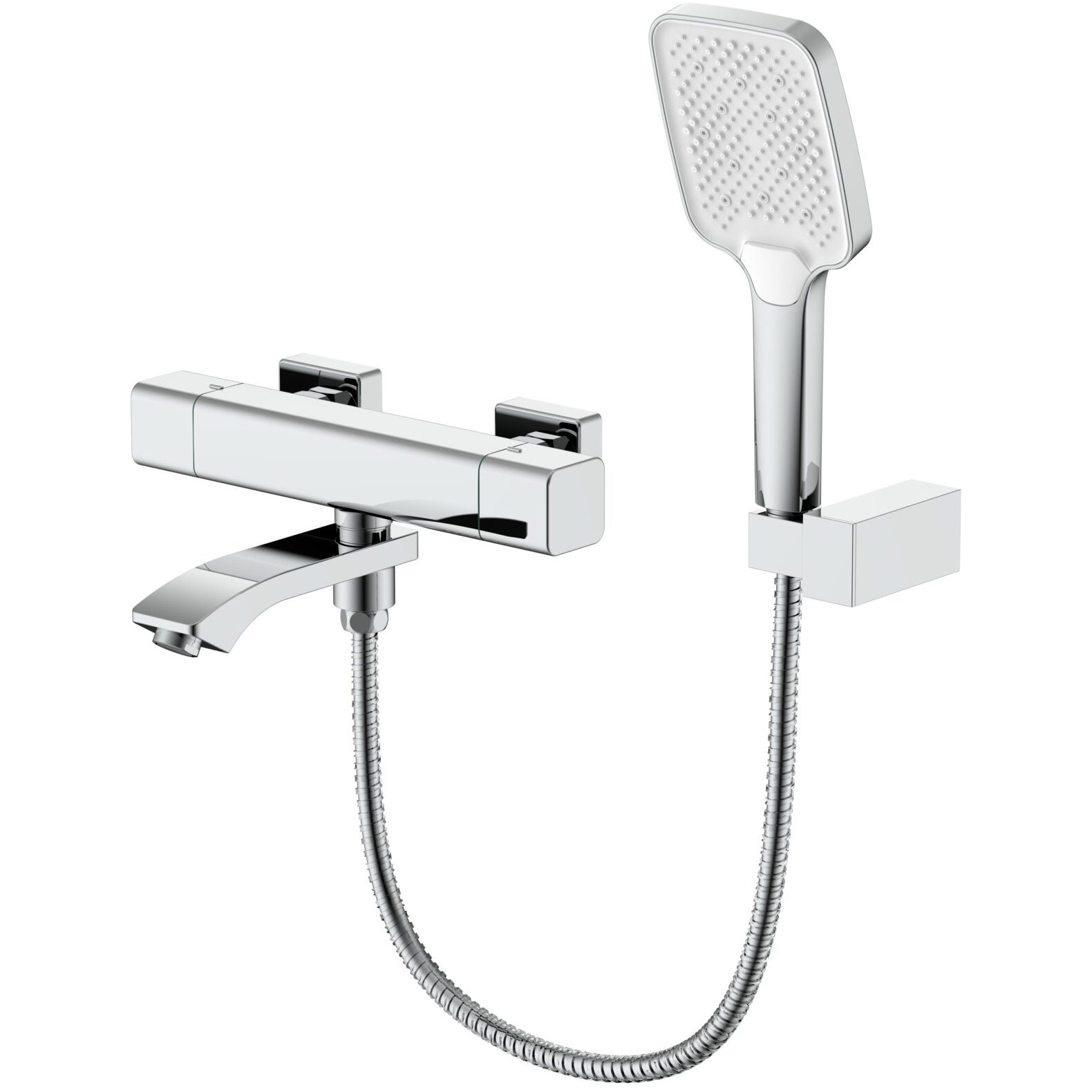 Материал – латунь. Термостатический картридж. Переключатель с керамическими пластинами (угол поворота – 180°). Излив с функцией переключения. Аэратор. Душевой шланг 1.5 м. Душевая лейка 3 режима. Эксцентрики с отражателями, держатель лейки.