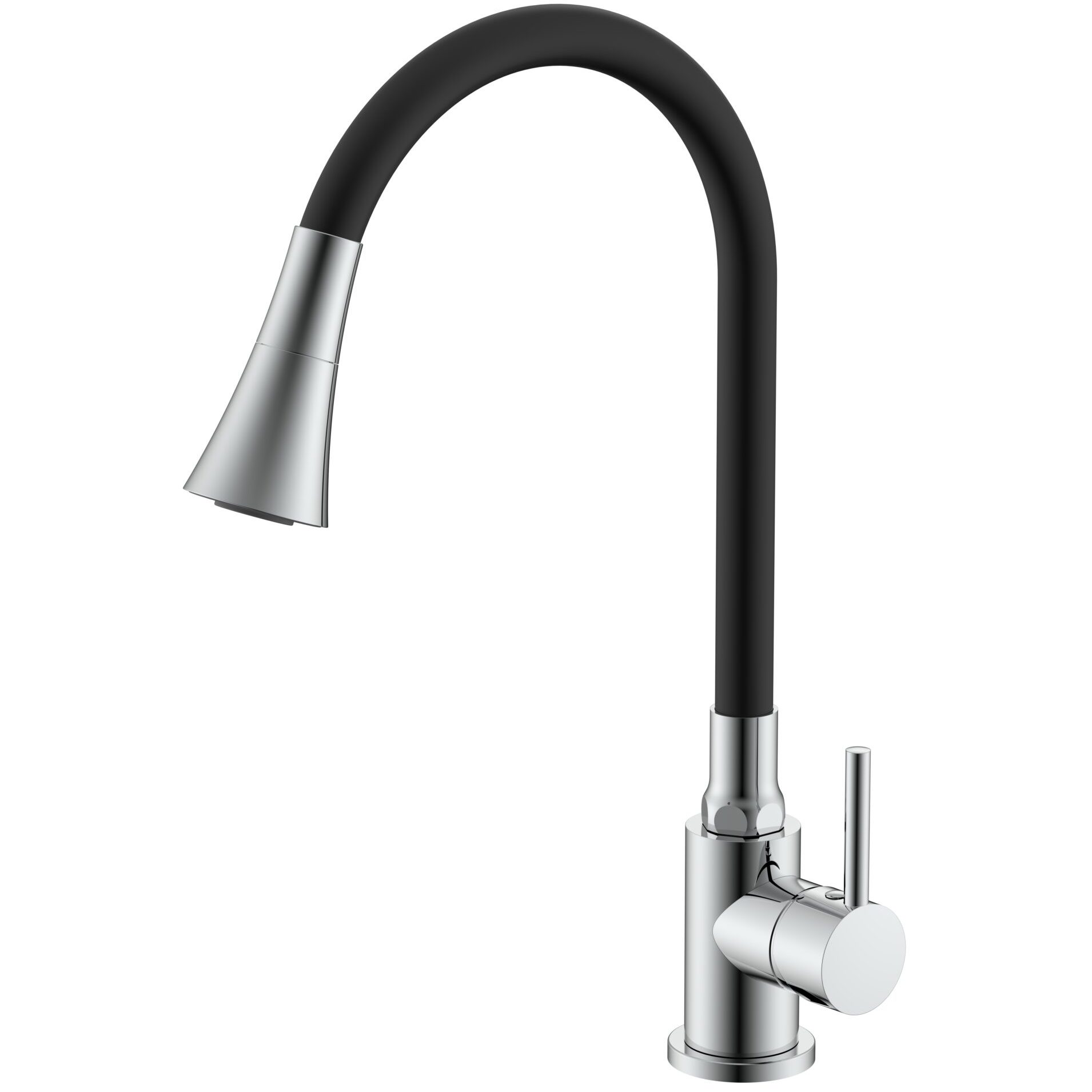 Материал – нержавеющая сталь. Цвет – хром + черный. Керамический картридж. Гибкий силиконовый излив. Аэратор 2 режима. Гибкая подводка 50 см. Крепежная гайка.