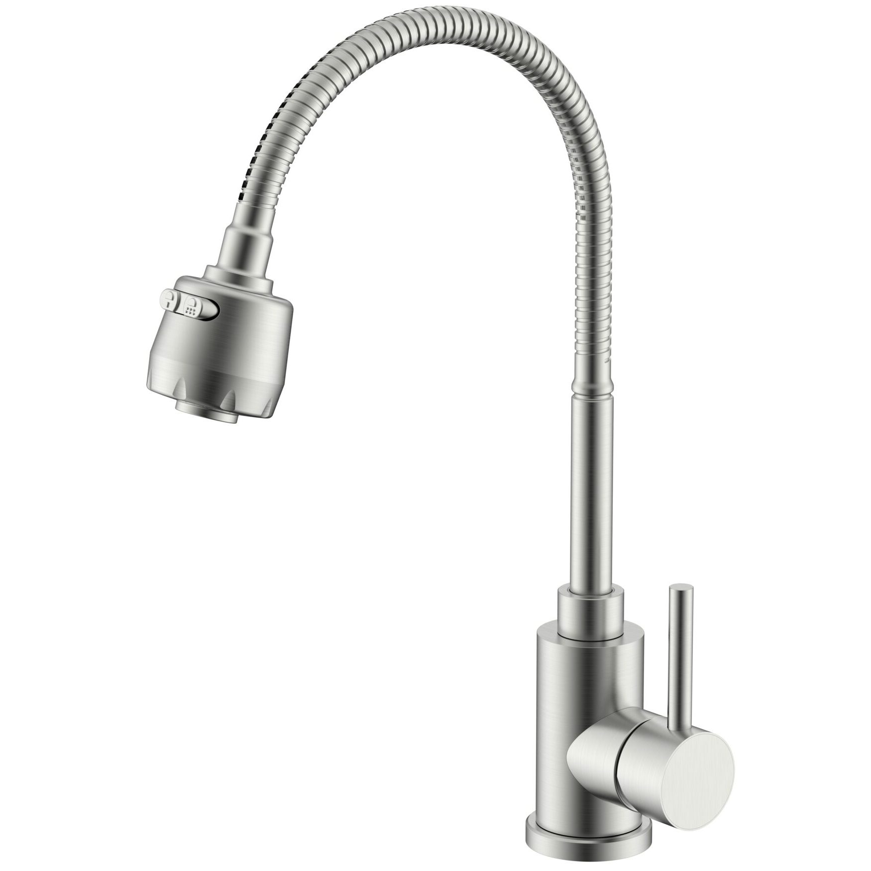 Материал – нержавеющая сталь. Цвет – сатин. Керамический картридж. Гибкий силиконовый излив. Аэратор 2 режима. Гибкая подводка 50 см. Крепежная гайка.